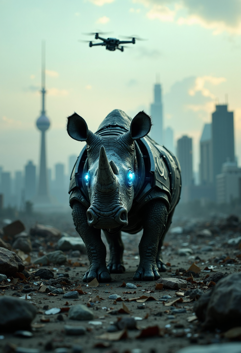 analog film photo The image depicts a futuristic, cybernetic rhino standing in a desolate, post-apocalyptic cityscape. The rhino's body is covered in metallic plating and wires, with glowing blue lights embedded in its horn and eye socket. Its skin appears rough and cracked, as if it has been exposed to the elements for an extended period. In the background, the city skyline stretches out, with crumbling buildings and debris-filled streets. The sky above is hazy and gray, with a faint glow of orange on the horizon. A small drone can be seen flying in the distance, adding to the sense of desolation and abandonment. The overall atmosphere of the image is one of decay and neglect, with the once-majestic rhino now reduced to a mere machine. The use of muted colors and the emphasis on the rhino's mechanical features creates a sense of unease and foreboding, suggesting that something has gone terribly wrong in this world. The composition of the image is well-balanced, with the rhino positioned centrally in the frame and the background blurred to emphasize its presence. The lighting is dim, with the only source of illumination coming from the glowing blue lights on the rhino's body. This creates a sense of drama and tension, drawing the viewer's attention to the rhino and its surroundings. The mood of the image is somber and reflective, inviting the viewer to contemplate the consequences of human actions on the natural world. The use of a cybernetic rhino as the central figure adds a layer of complexity to the narrative, raising questions about the relationship between technology and nature. In terms of artistic style, the image appears to be a blend of science fiction and post-apocalyptic genres, with influences from classic works such as "Blade Runner" and "Mad Max." The use of metallic plating and wires on the rhino's body creates a sense of industrialism and futurism, while the desolate cityscape adds a touch of dystopian realism. Overall, the image is a powerful commentary on the impact of human activity on the environment, and the consequences of our actions on the natural world. It invites the viewer to reflect on the relationship between technology and nature, and the importance of preserving the beauty and wonder of the natural world. . faded film, desaturated, 35mm photo, grainy, vignette, vintage, Kodachrome, Lomography, stained, highly detailed, found footage