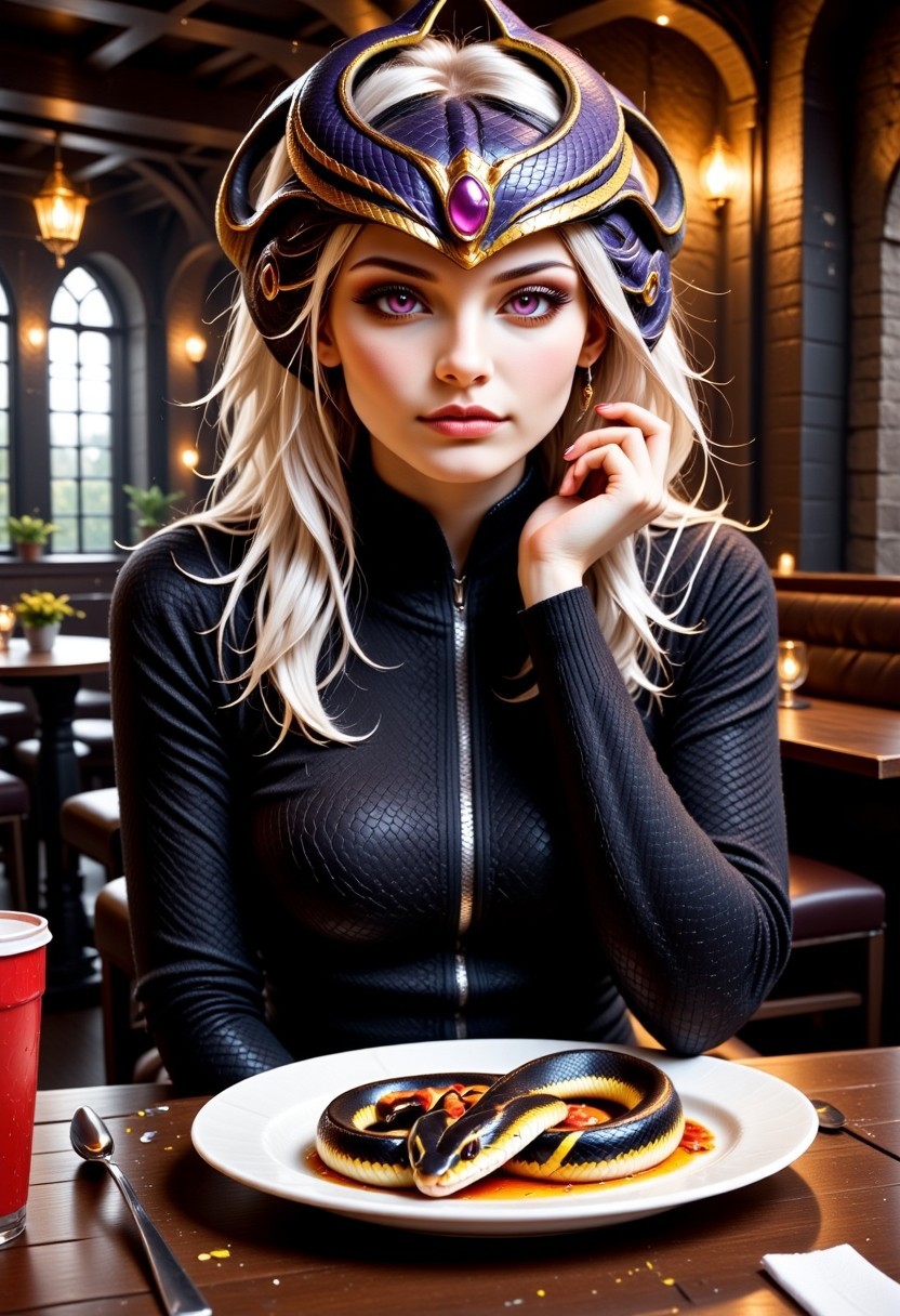 A beautiful girl Syndraa. She is wearing a black sweater. She has purple eyes and long white hair. She is wearing an ornate headpiece that resembles a helmet, with a purple gem in the middle. She is sitting at a restaurant table in a medieval restaurant. In front of her there is a white plate and soda. She is eating sn4k3. sn4k3 on her plate. Snake on her plate, she is eating a snake. fat snake on her plate cut in half