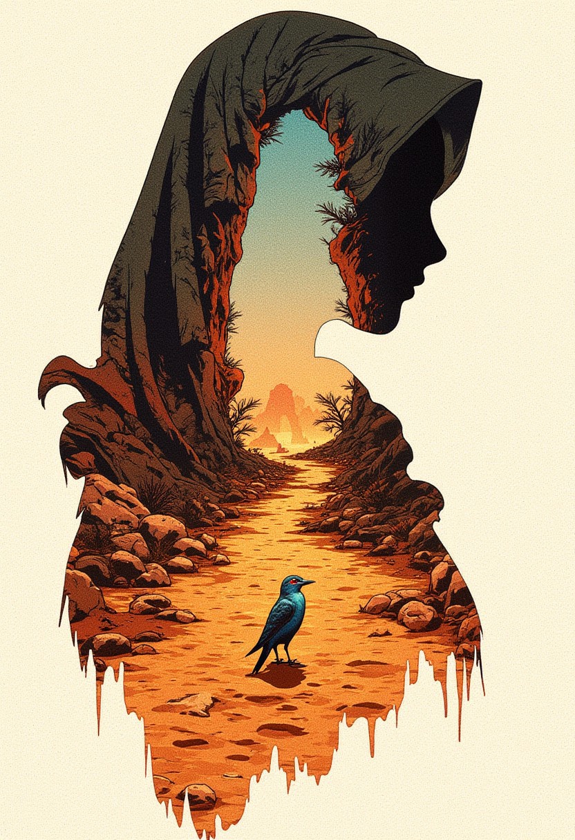 bo-exposure image of an alien world's desert oasis with a small, brightly coloured bird in the middle. The oasis is within a double exposure silhouette of a woman with a Arabian style cowl and hood on. The exterior of the silhouette is a barren sandy desert, highlighting the contrast between the two biomes. It cleverly blends with the background with the interior of the silhouette giving it the impression of one cohesive image. Retro Anime aesthetic