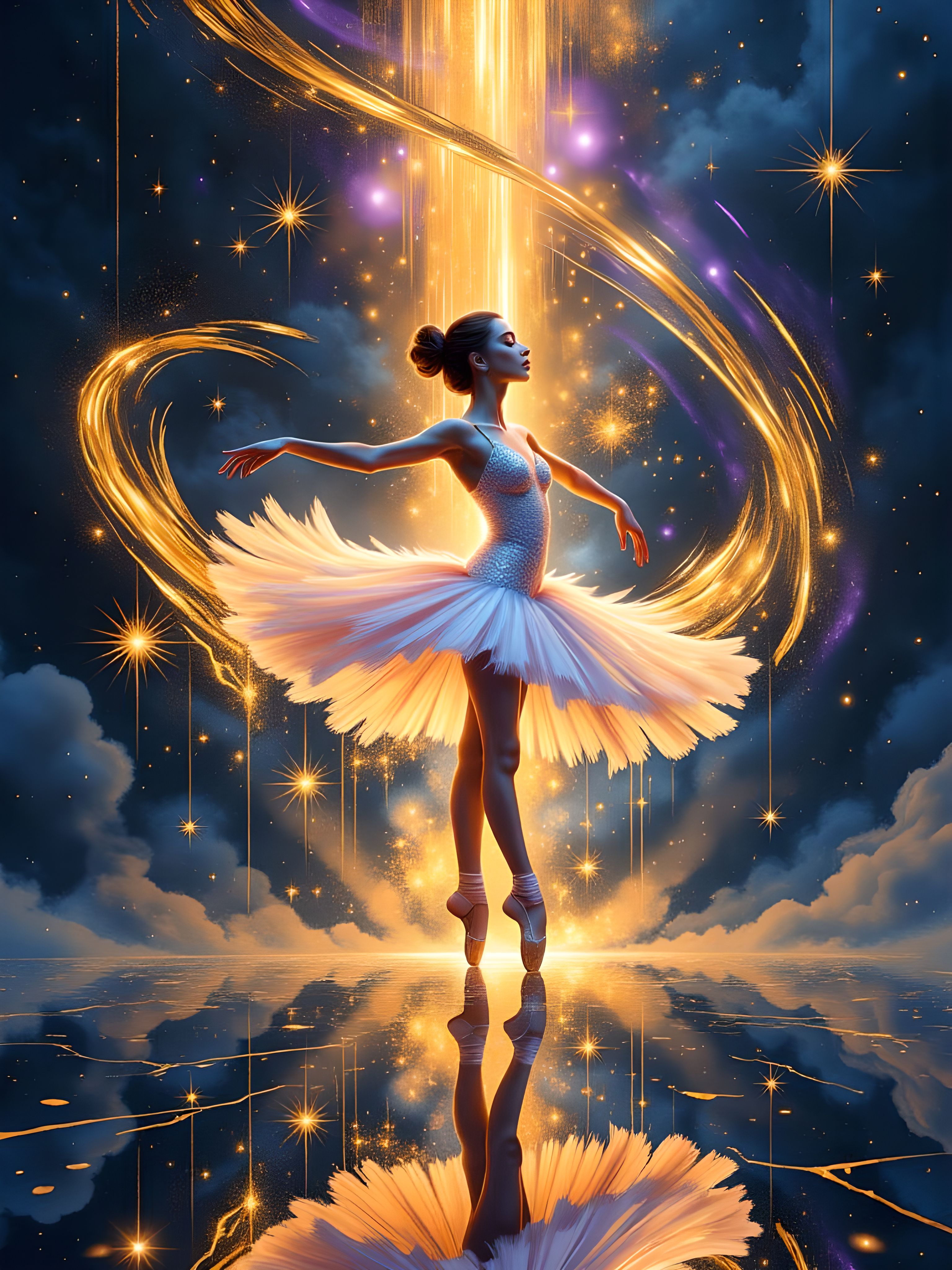 A lone ballerina, her delicate form suspended mid-pirouette, becomes the centerpiece of an abstract, dreamlike space. Her silhouette is fragmented, as if she is being pulled apart by streaks of motion and ribbons of light, each thread capturing a fraction of her elegance. Her flowing tutu is not fabric but a swirling vortex of translucent shapes, a fusion of pastel hues that dissolve into the surrounding void. The stage beneath her is a plane of reflective glass, cracked in places, creating a kaleidoscope of her fragmented image. Every point of contact with her delicate toes sends ripples of energy spiraling outward, distorting the boundaries of the space around her. Above, an amorphous light source bleeds gold and violet rays, casting sharp, angular shadows that shift and dance in harmony with her movement. The backdrop is a void of deep indigo, punctuated by faint, geometric patterns resembling constellations—each star a symbol of precision, grace, and the ephemeral nature of her art. Her arms, stretched outward, are mirrored by glowing arcs that trail behind her, fading into infinity like the echoes of a fleeting melody. Her face, soft and serene, blurs slightly at the edges, as though she is both present and dissolving into the intangible. aidmaimageupgrader, aidmaMJ6.1m, detailmaximizer, mythp0rt, ne0nfant4sy, drkfnts, hkmagic <lora:aidmaImageUpgrader-FLUX-V0.2:0.8> <lora:aidmaMJ6.1_aidmaMJ6.1-FLUX-v0.4:0.7> <lora:Dreamy_Illustrations_FLUX_LoRA-000001:0.7>