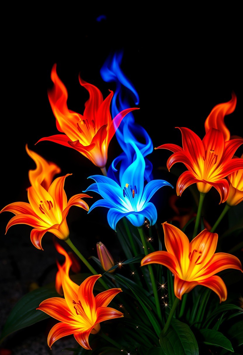 Flowers with petals made of red yellow orange and blue flames, beautiful and mesmerizing flame lilies growing on a green leaved bush. They are giving off sparks. They are incredibly detailed with Petals made of flame. The background is dark in contrast to the brilliant colours of the flowers. The scene is magical and enchanting.