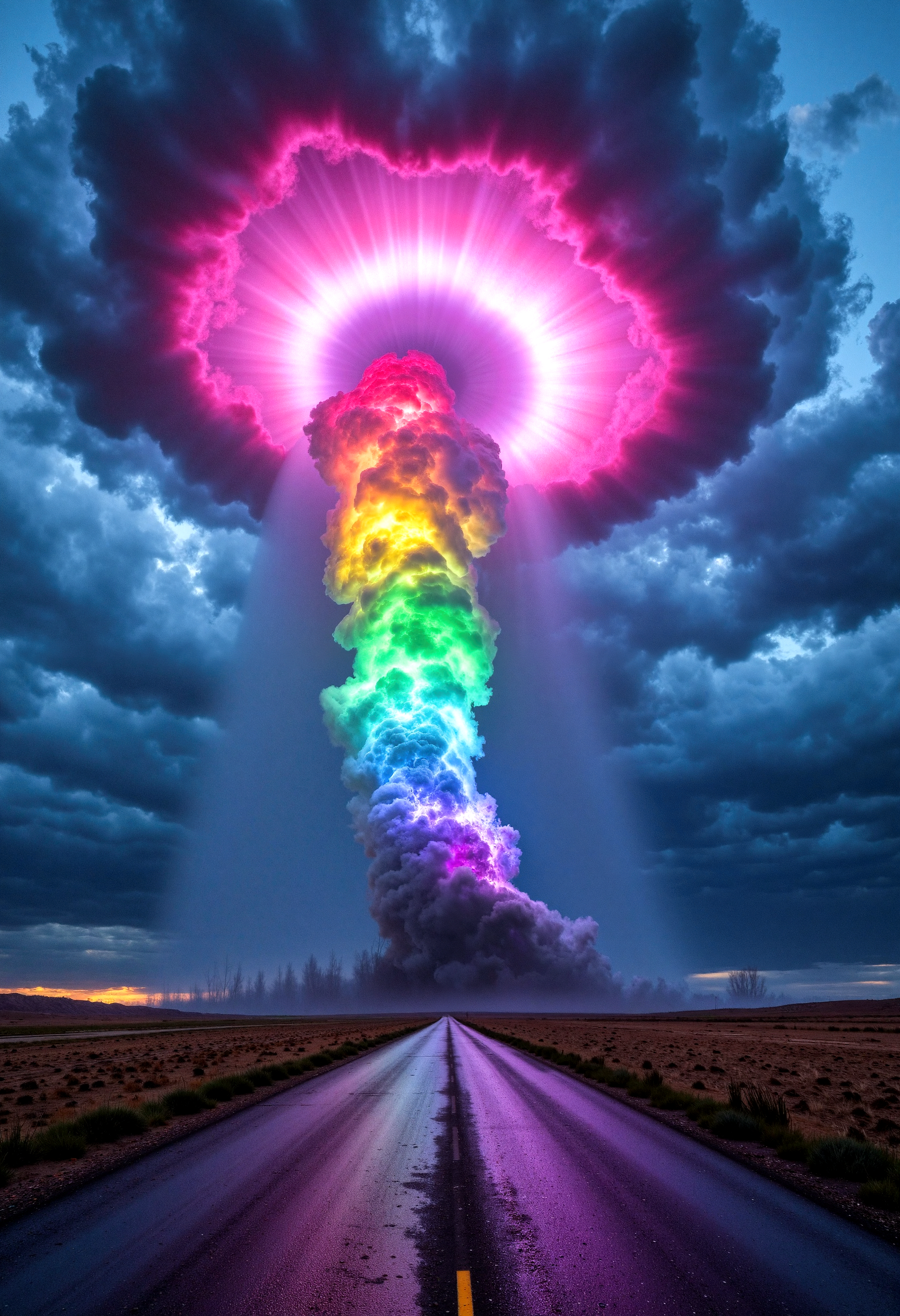 "An ethereal, multicolored tornado rising majestically against a backdrop of stormy clouds, its vibrant spirals glowing with iridescent hues of pink, purple, green, and yellow. Each layer of the tornado is finely detailed with cloud-like textures and illuminated edges, while the base emits a dark plume of smoke. The desolate road leading into the tornado’s core adds depth, reflecting faint neon tones from the swirling colors above, creating an apocalyptic yet mesmerizing atmosphere."