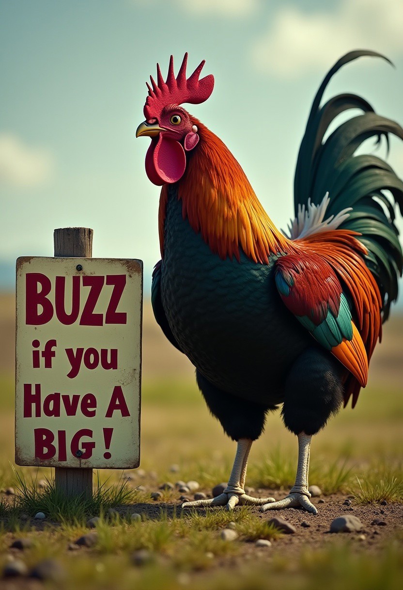 A sign in the ground it says "Buzz If You Have A Big!", next to the sign is a giant cockerel standing majestically, realistic, cinematic shot,