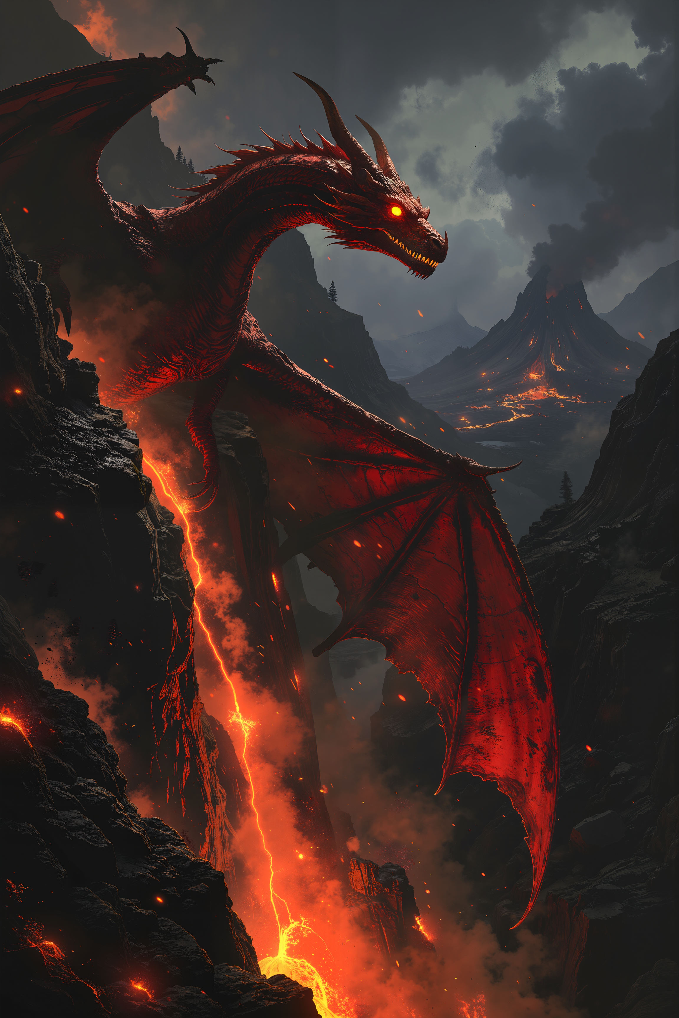 Perched on the edge of a jagged, volcanic cliff, a massive, ruby-scaled dragon with glowing crimson eyes watches the molten lava bubbling far below. The dragonâs wings, large and leathery, are tucked close to its body, their edges lined with glowing veins of molten energy that pulse in time with the flow of lava beneath the earth. Smoke and ash fill the air, carried by the hot winds that rise from the depths of the volcano, and the sky above is dark and heavy with clouds that glow faintly with the light of distant lightning. The dragonâs talons grip the edge of the cliff, causing small rocks and debris to tumble down into the fiery pit below. Its nostrils flare as it inhales the sulfurous air, its eyes narrowing as it surveys the smoldering landscape. Surrounding the dragon, the remnants of ancient lava flows stretch out like veins of fire across the rocky terrain, their surfaces still glowing with the heat of the earthâs core. The air is thick with the scent of burning rock and the distant rumble of volcanic activity, a constant reminder of the raw power lurking just beneath the surface. The scene is one of primal intensity, where the dragonâs presence mirrors the fiery chaos of the volcanic world it inhabits. , detailed background Fantastic lighting. Detailed shadows.intricate details, vivid colors, hyper-detailed, ultra-sharp, , <lora:Luminous_Shadowscape-000016:0.4><lora:black_fantasy_1.0:0.4><lora:Glitchcore_Flux:0.4><lora:- Flux1 - vanta_black_V2.0:0.4>