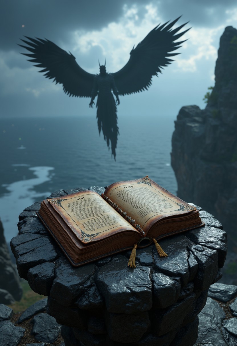 A tattered leather-bound grimoire lies open atop a blackened stone pedestal at the summit of a shattered mountain, surrounded by jagged floating islands suspended in a storm-torn sky. The book’s pages, inked with symbols that shift and flicker like dying embers, turn on their own as if searching for a forgotten spell. Thunder rumbles in the distance, and in the farthest reaches of the sky, colossal winged shapes move in slow, deliberate circles, watching. , aidmabaldursgate3, aidmamj6.1, aidmafluxpro1.1