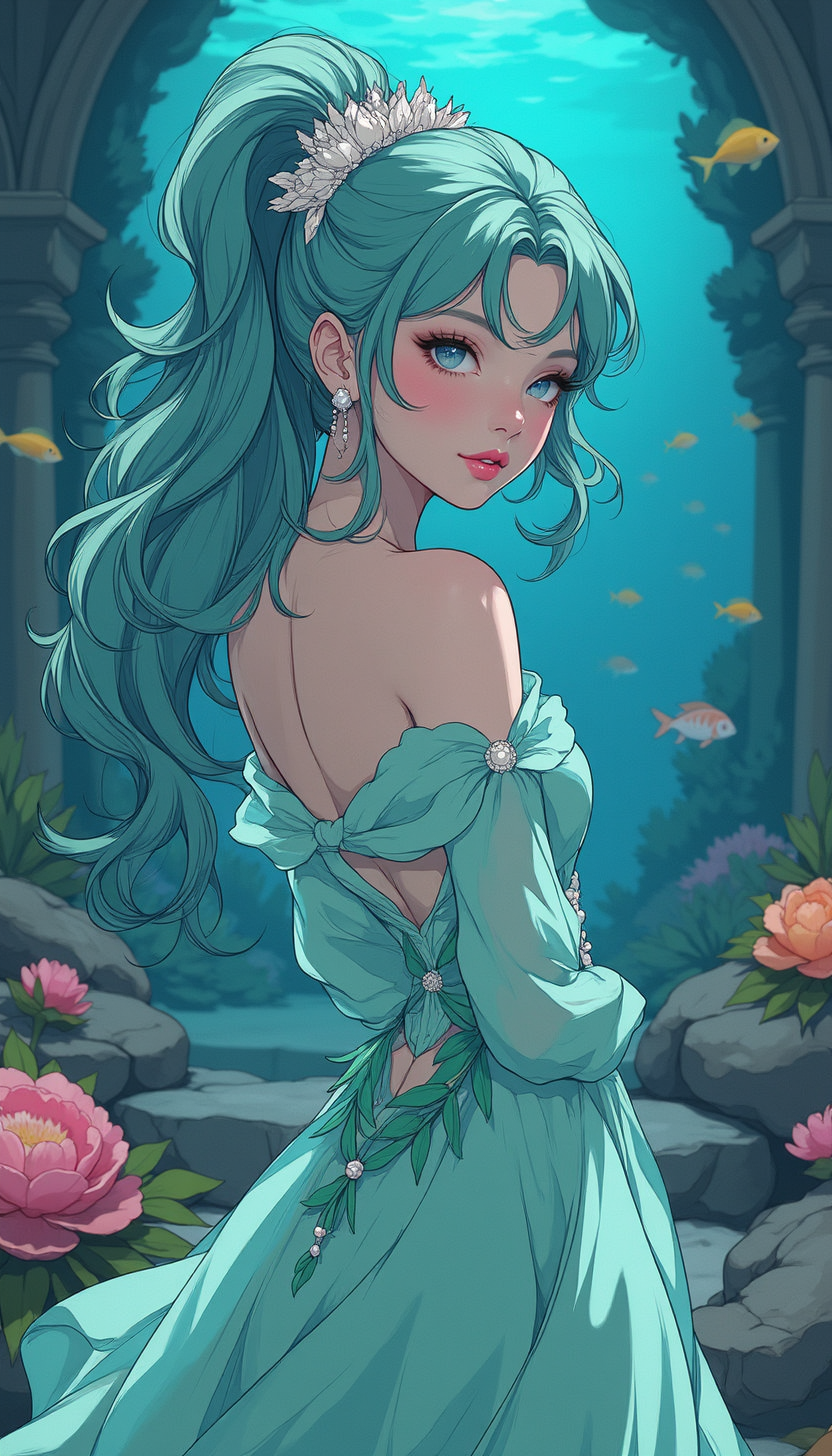 A high-quality, whimsical digital artwork in the style of pinksoftcoreanime, A serene princess with wavy aquamarine hair, tied into a loose, flowing ponytail secured by a pearl-encrusted comb. She wears a seafoam-green dress with layers of translucent fabric that shimmer like ocean waves, decorated with tiny pearls and seaweed-like embroidery. The background is an underwater palace illuminated by bioluminescent coral, with schools of glowing fish swimming around her.