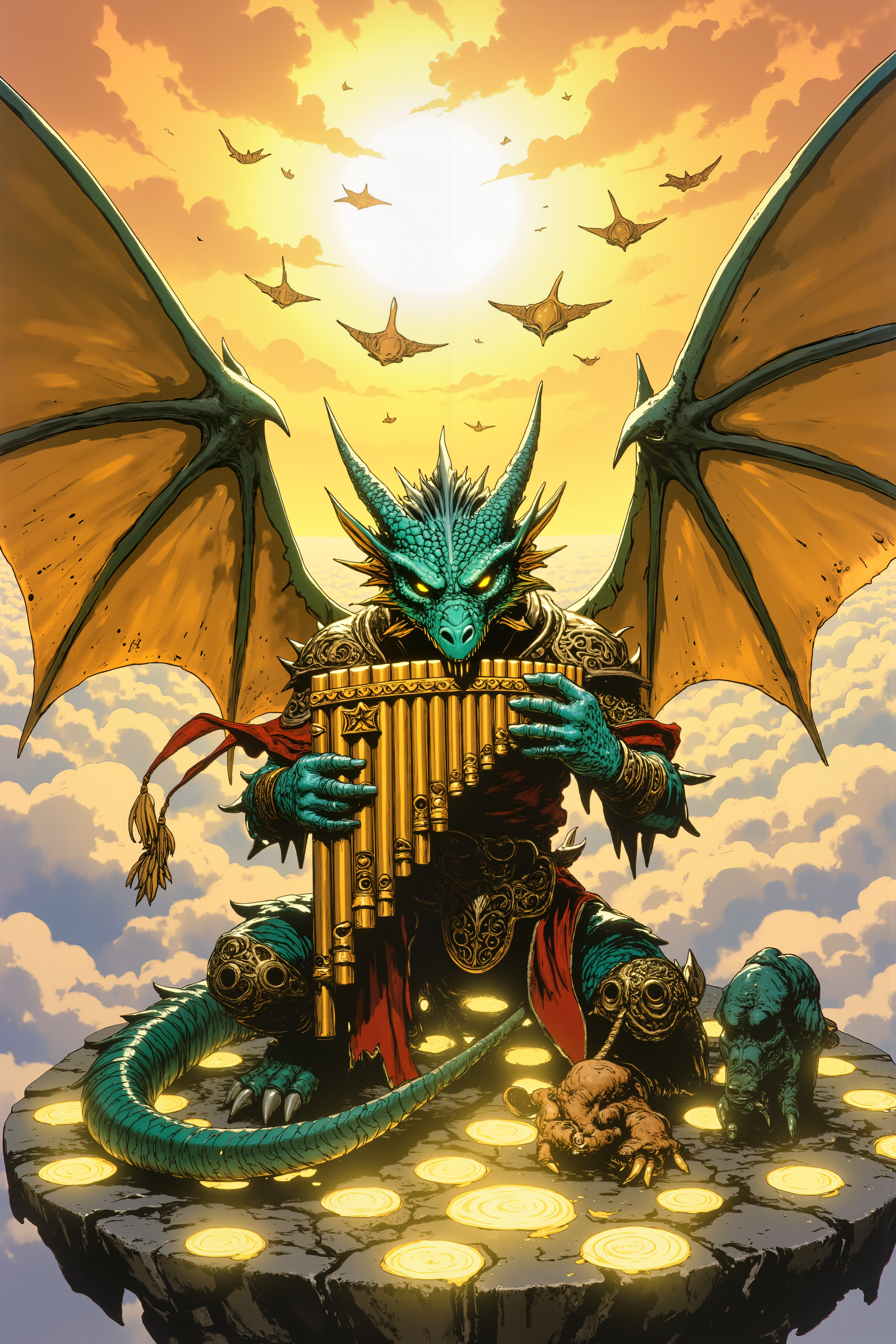 On a floating platform of glowing, translucent stones, a half-dragon bard with emerald-green scales plays an intricately carved golden panflute. Below, an endless sea of rolling clouds stretches as far as the eye can see, lit by a radiant sunrise that bathes the entire scene in warm, golden light. The bardâs wings, massive and shimmering, are half-folded behind him, catching the sunlight and reflecting a spectrum of iridescent colors. His music flows like a gentle breeze, causing the floating stones to hum faintly in harmony with his melody. Around the platform, small, glowing orbs of light flit about, their movements synchronized to the rhythm of his song. The bardâs piercing golden eyes gleam with joy as he pours his heart into the music, his clawed fingers moving with grace and precision. The air is cool and crisp, carrying the faint scent of ozone and distant rain. Above, flocks of ethereal creatures resembling translucent manta rays glide silently through the air, their graceful movements adding to the surreal beauty of the scene. The bardâs music seems to echo endlessly through the skies, a melody of peace and wonder that resonates across the heavens. , detailed background Fantastic lighting. Detailed shadows.intricate details, vivid colors, hyper-detailed, ultra-sharp, High resolution, high detail. Highly detailed., <lora:Ev_Ganin:0.4><lora:Vintage comic book:0.4><lora:RetroAnimeFluxV1:0.15><lora:Greg_Capullo_style:0.4><lora:jeanClaude_Mzires_Style_FLUX-000001:0.4><lora:Flux_Ink_Anime:0.4> <lora:PANFLUTE_FLUX>