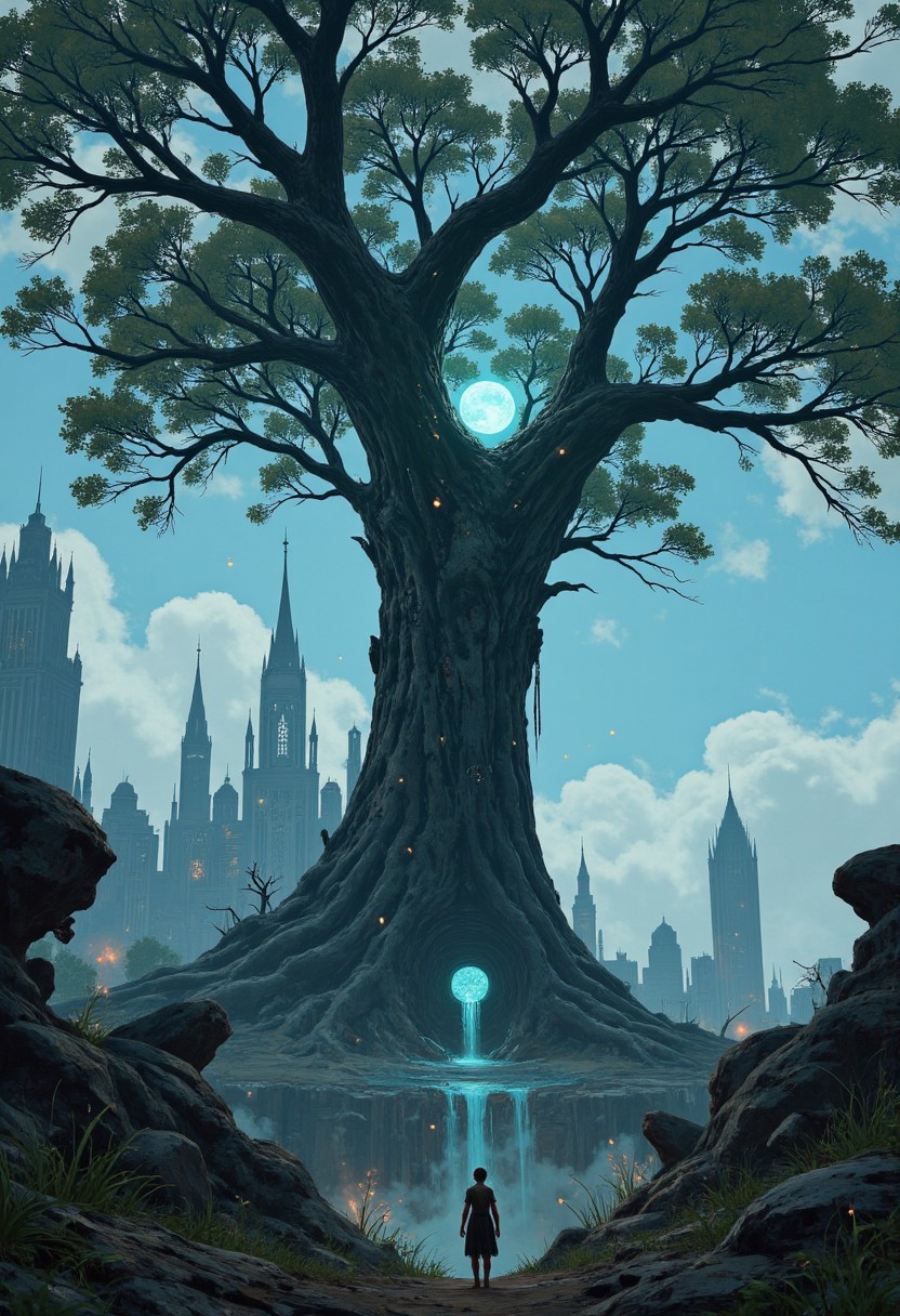 A colossal tree made entirely of stone stretches toward a sky filled with drifting islands, its roots coiling around the remnants of an ancient city. At its highest branch, a door of glowing runes remains locked, pulsing in rhythm with something unseen beneath the earth. , aidmabaldursgate3,