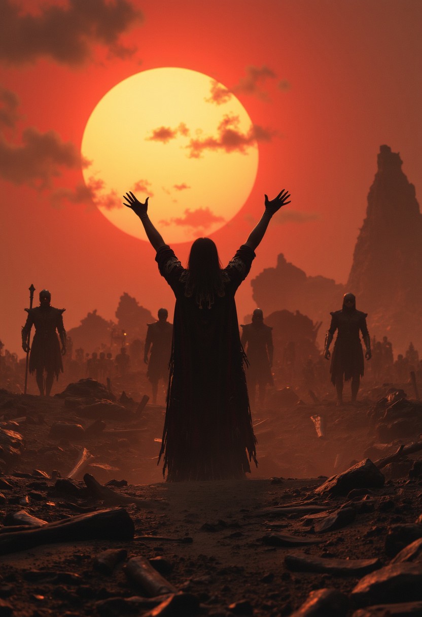 A necromancer stands knee-deep in a battlefield of bones, their arms raised as skeletal warriors claw their way out of the earth. From an over-the-shoulder angle, the rising dead stretch into the distance, forming an army under the necromancer’s command. In the background, a dying sun bleeds into the sky, casting long, apocalyptic shadows over the ruined world. , aidmabaldursgate3, aidmafluxpro1.1