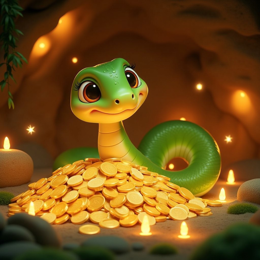 cute snake. A cute green snake with smooth, soft scales is happily coiled around a large pile of shimmering gold coins. The snake’s expression is full of joy, with a wide, cheerful smile and sparkling eyes, showing its contentment. Its body curls lovingly around the golden coins, all neatly stacked. The gold catches the soft, flickering light from nearby glowing crystals embedded in the cave walls, casting a warm, inviting glow that contrasts perfectly with the snake’s pastel hues. The cave itself is snug and cozy, with smooth stone walls and soft, plush moss scattered across the floor. Small, twinkling fireflies float around, adding to the magical atmosphere. The warm, golden light from the coins and crystals fills the cave, creating a serene and comforting ambiance. The scene exudes a whimsical, peaceful vibe, with the snake happily enjoying its treasure in the tranquil, magical cave.