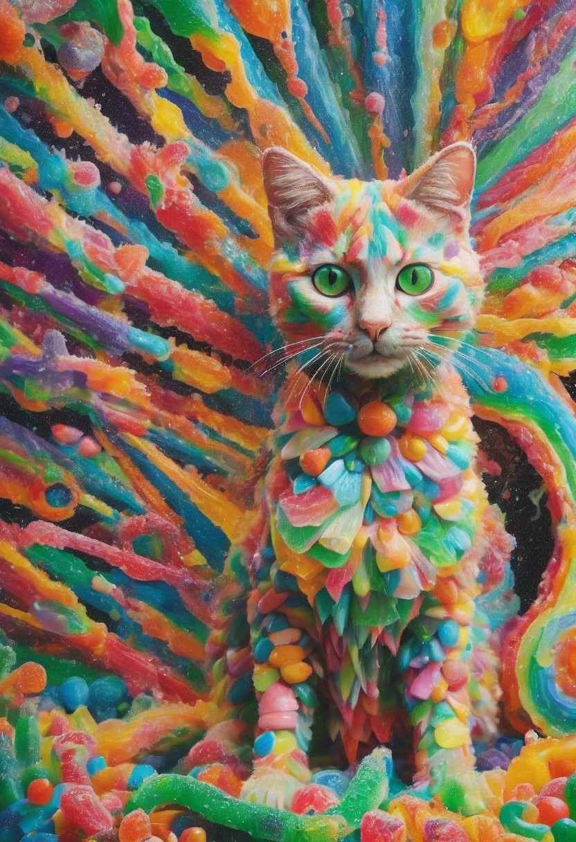 abstract expressionist painting Pop Art and cubism early 20 century, straight lines and solids, cute cat face without body, (((warm colors))), green, intricate details, hologram floating in space, a vibrant digital illustration, dribbble, quantum wavetracing, black background, behance hd, vivid colors, flat color, 2D, strong lines, Pop Art . energetic brushwork, bold colors, abstract forms, expressive, emotional, candy