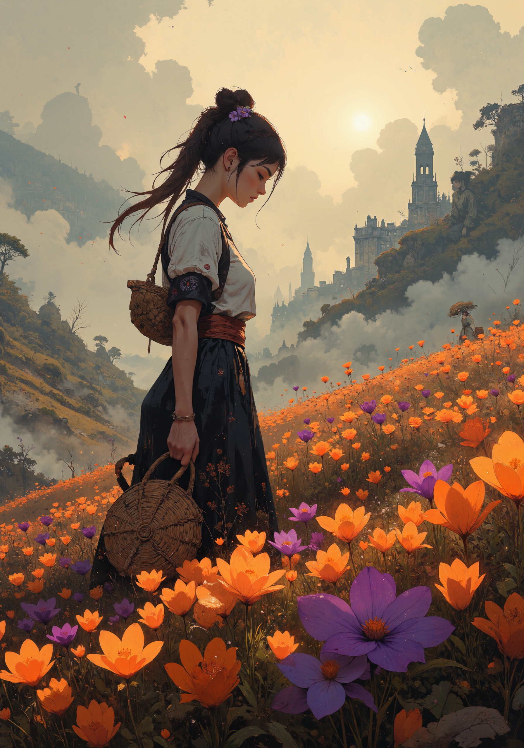 Ethereal morning mist, young woman tending to a vibrant saffron field, golden crocus flowers in full bloom. Traditional embroidered dress, hair adorned with saffron threads. Delicate handpicking gestures, woven basket at her side. Soft sunlight filtering through fog, creating a dreamy atmosphere. Rolling hills in background, ancient stone walls. Dew-kissed petals, vibrant purple and orange hues. Intricate details of stigma and stamen. Weathered hands, determined expression. Rustic wooden tools nearby. Harmonious blend of tradition and modernity. Bokeh effect, shallow depth of field. Masterpiece, 8k resolution, hyper-realistic textures. Oil painting aesthetic, impressionistic brushstrokes. Golden hour lighting, lens flare. Evocative cultural symbolism, timeless agrarian beauty. <lora:Ethereal Brush Anime v2.0:0.5> <lora:Niji V2B:0.5> <lora:VividMidjourneymimic-Flux_v1.0:0.6> <lora:style_of_Norman_Ackroyd_FLUX_100:0.7> <lora:MoriiMee_Gothic_Niji_Style_FLUX:0.3> <lora:flux_dev:1>