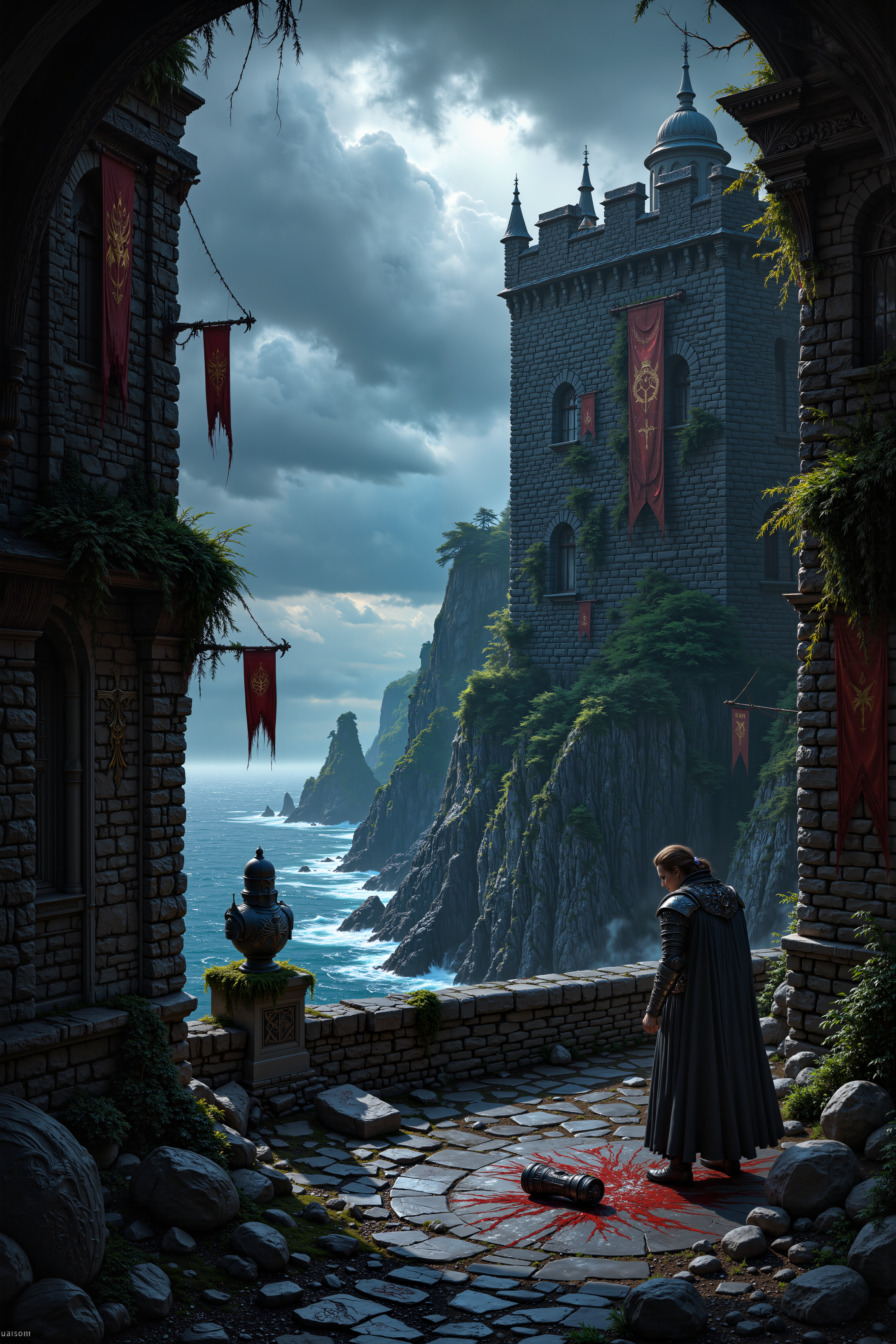 A grim and weathered keep overlooking the jagged cliffs of a windswept coast. The dark stone walls are draped with moss and banners tattered from years of neglect. In the courtyard, an armored warrior with a long, black coat inspects the shattered remains of a statue. The ground around it is marked with arcane symbols drawn in blood, and the faint scent of iron lingers in the cold air. Dark clouds gather above, and a distant roll of thunder signals the coming storm. The warriorâs eyes narrow as he senses something ancient and malevolent stirring within the keep.<lora:midjourney_whisper_flux_lora_v01:0.5><lora:aidmaMJ6.1-FLUX-V0.1:0.4><lora:FluxMythP0rtr4itStyle:0.4><lora:detailed_flux_ntc:2.2><lora:aidmaImageUpgrader-FLUX-V0.1:0.65>