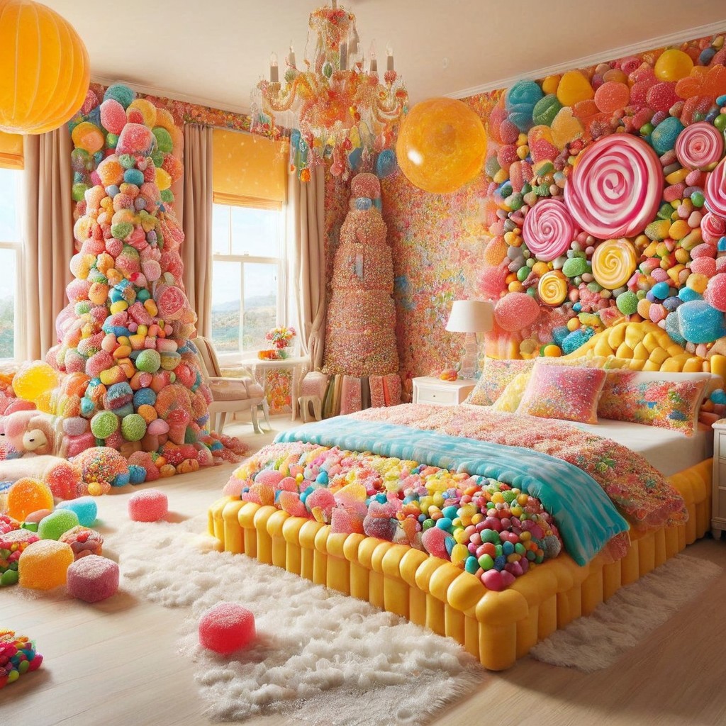 a luxury bedroom in candy style, sunny, luxury, made of candy, detailed, hyperrealistic, masterpiece, magazine advertisement,8K wallpaper,