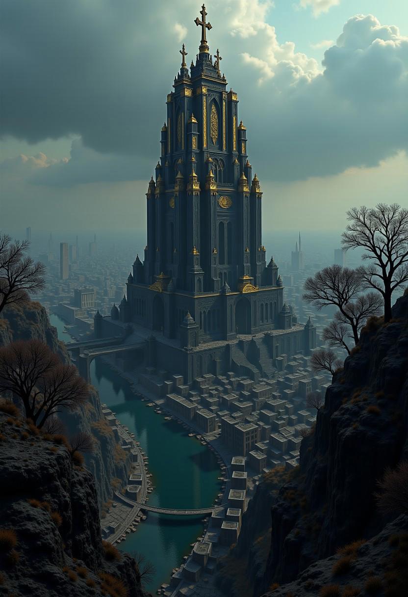 An aerial view reveals a dystopian Constantinople of the future, where a colossal, dark anarchist style skyscraper cathedral dominates the skyline. Its towering structure is adorned with intricate light golden ornaments, shimmering against the bleak cityscape. Atop the cathedral, a massive Greek cross stands as a stark symbol of resilience. A narrow, winding river flows around the base of the cathedral, its reflective waters contrasting with the somber architecture. The scene is rendered in photorealistic detail, capturing the eerie blend of ancient grandeur and futuristic decay, with the city's desolate streets and crumbling buildings stretching into the horizon. Anarchist poster