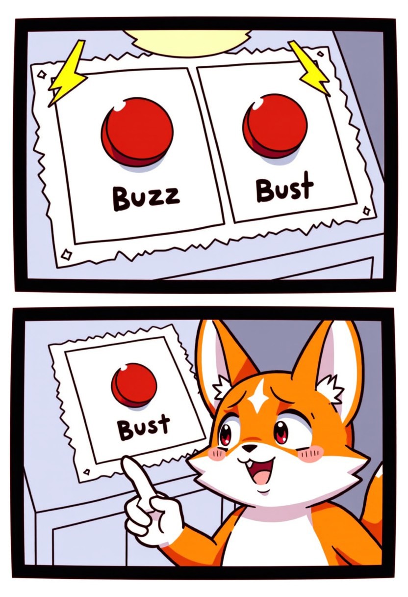 A stylized and high-resolution image of a slot machine with two buttons, In twobuttonsmeme style. Top panel: the buttons are "Buzz" and "Bust". There's a (yellow lighting symbol with tapered ends) plastered on the machine. Bottom panel: An anime-styled fox kemonomimi with (orange ears with white fluff), wiping sweat, hovering finger over the "Bust" button.