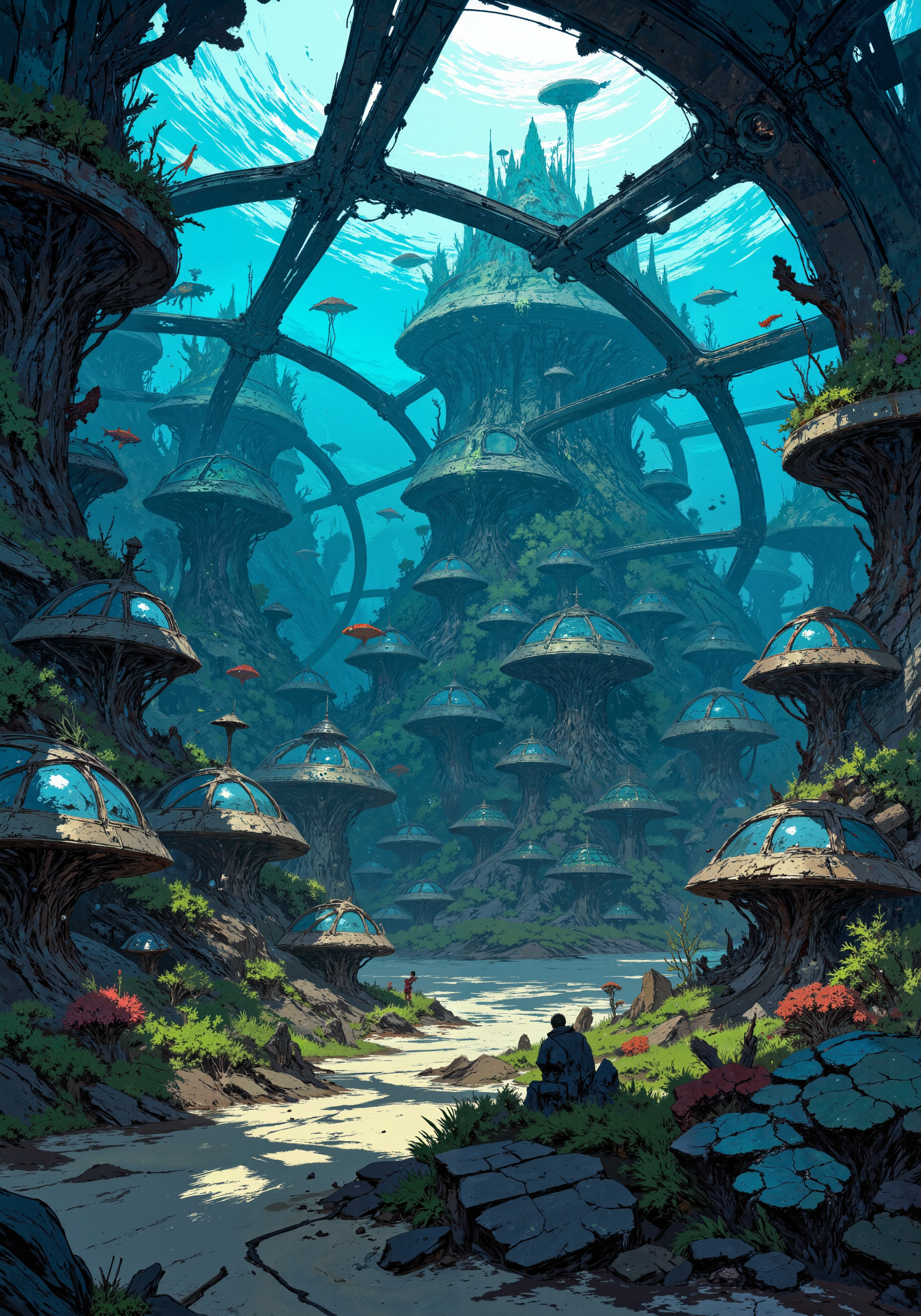 Underwater eco-sanctuary, bioluminescent coral structures, sustainable underwater living pods, energy-efficient glass domes, nutrient-rich algae farms, tidal power generators, self-sustaining aquaponics systems, recycled plastic building materials, symbiotic marine life integration, deep sea thermal vents for geothermal energy, pressurized airlocks, advanced water filtration systems, oxygen-producing kelp forests, buoyant modular architecture, hydrodynamic design, bioluminescent lighting, underwater vertical gardens, adaptive smart materials, holographic communication interfaces, 8k resolution, photorealistic rendering, intricate detailing, harmonious integration with marine ecosystem, masterpiece quality <lora:Hand v2:0.7> <lora:Ganin_II:0.7> <lora:SameFace_Fix:0.7> <lora:FLUX-daubrez-DB4RZ:0.7> <lora:FluxMythV2:1.0> <lora:flux_dev:1>