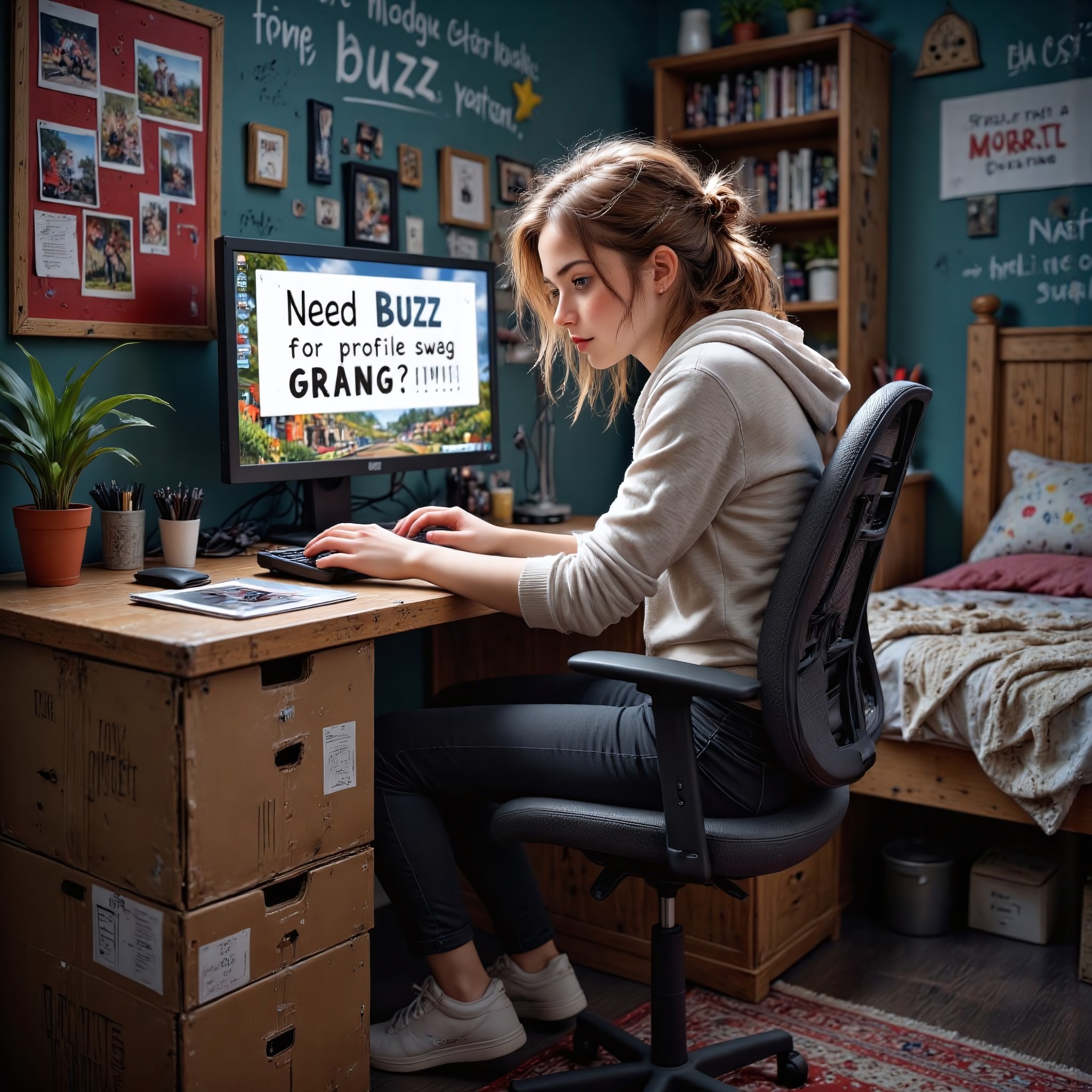 gamer girl playing at a scuffed set up, computer single monitor ontop of cardboard box, cardboard dirty bed in the corner of the room, the girl has messy hair and messy clothes, on the screen read over her head reads with 'Need Buzz for profile swag' . also has 'buzz written on the wall