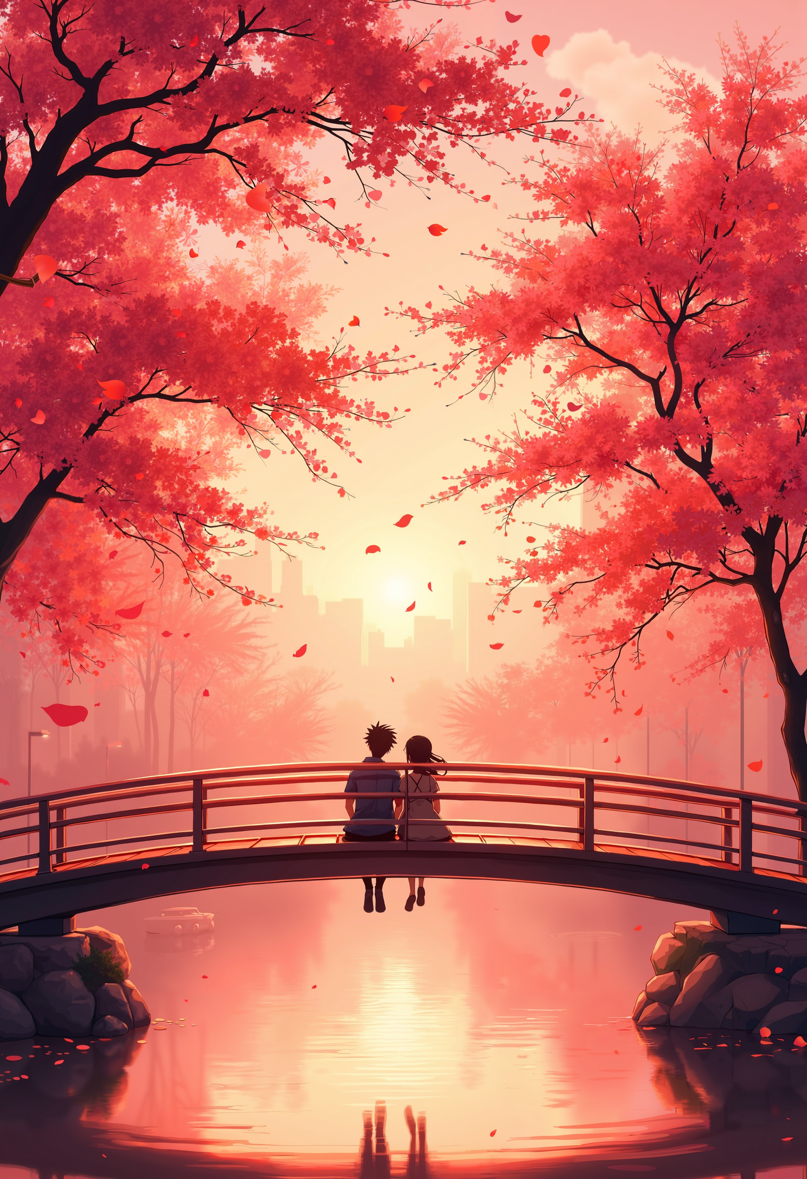 bo-romance, a digital artwork depicting a serene, autumnal scene, the scene is dominated by vibrant red cherry blossom trees, their branches swaying gently in the breeze, creating a soft, ethereal glow, the trees are adorned with delicate petals in various shades of red, adding a romantic, almost dreamlike quality to the scene, in the foreground, a small bridge crosses a calm, reflective body of water, reflecting the warm, orange hues of the sky and the trees, the bridge itself is made of metal and has a modern, minimalist design, with a few wooden railings and handrails on either side, two figures, a man and a woman, are seated on the bridge, facing each other, their silhouettes illuminated by the soft, warm light of the setting sun, casting a warm glow on the scene and creating a sense of tranquility, the background features a blurred, abstract cityscape, adding depth and perspective to the image, the overall style is reminiscent of traditional japanese anime art, with clean lines and a vibrant, almost ethereal quality<lora:boFLUX Romance Abyss.safetensors:1.0:1.0>