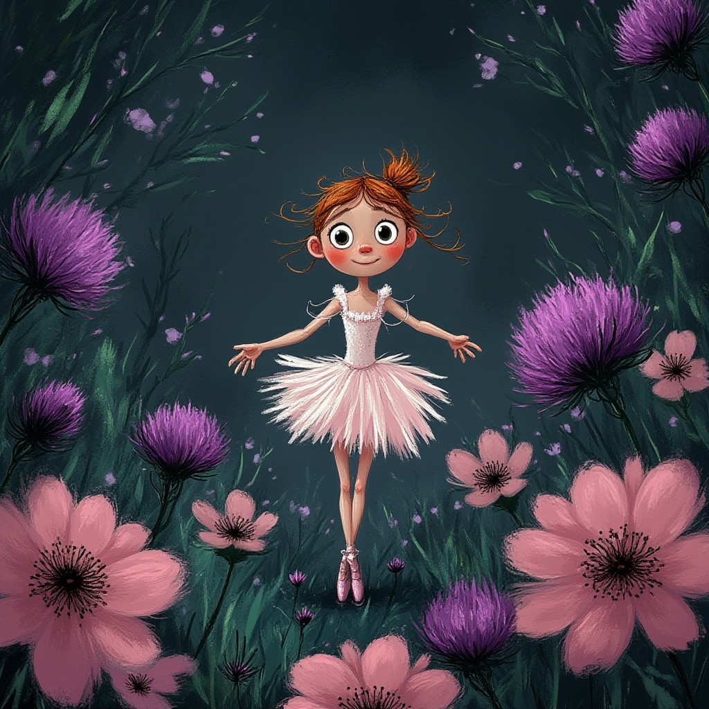 A whimsical illustration of a tiny ballerina in dark whimsical art style, wearing tutu and ragged pointe shoes, standing among pink peonies and purple thistles, digital painting with expressive brushstrokes, twilight meadow background, characteristic Tim Burton inspired design with dreamy eyes