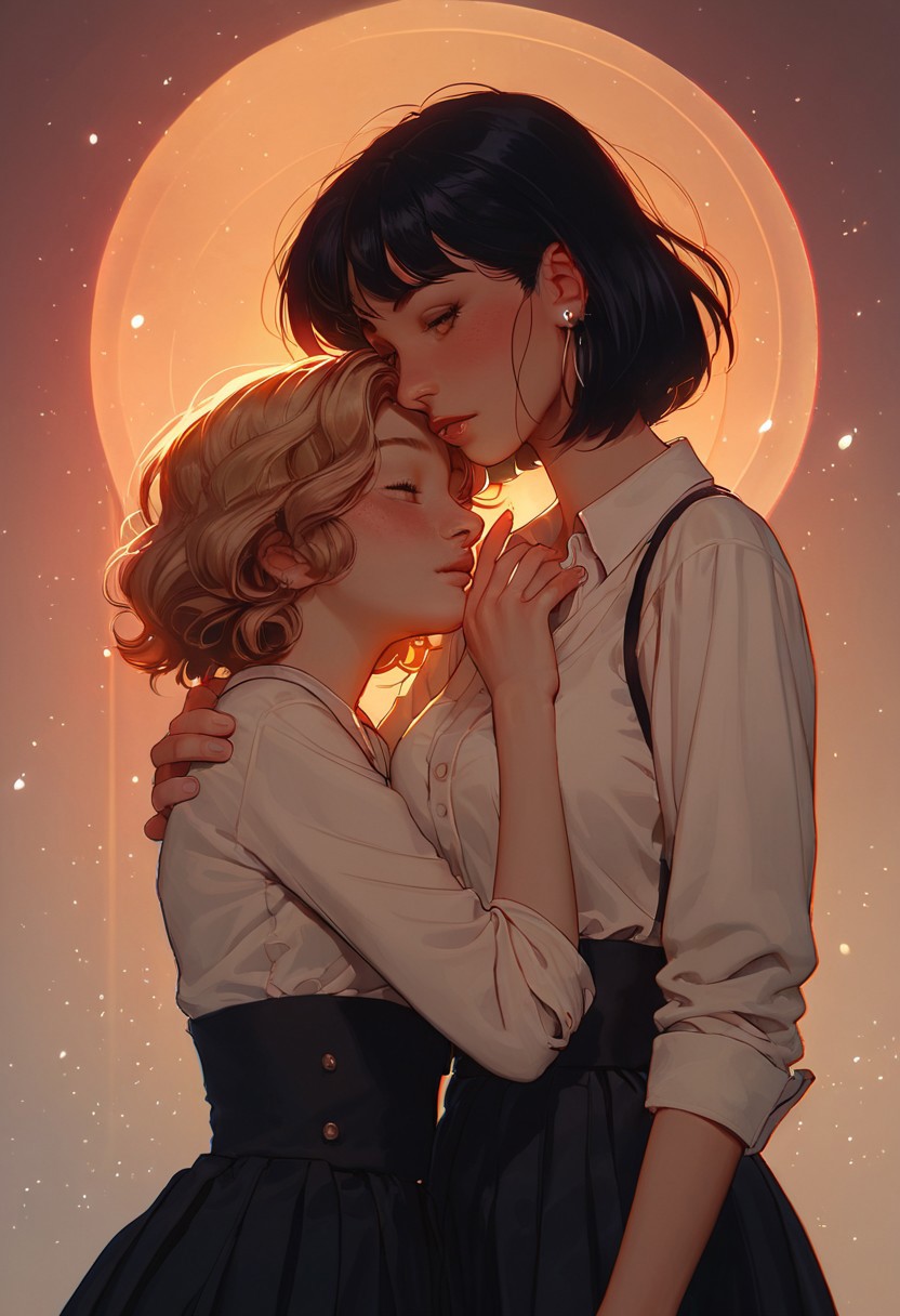 score_9, score_8_up, score_7_up, score_6_up, score_5_up, rating_safe, source_anime, (cinematic lighting:1.3), (soft glow:1.3), (romantic ambiance:1.4), highly detailed, 2girls, yuri romance, (tall athletic girl:1.4), (short petite girl:1.4), different body types, long wavy blonde hair, short bob black hair, (intense eye contact:1.5), (blushing:1.4), delicate hand holding, (warm smiles:1.3), matching school uniforms, flowing skirts, (gently swaying hair:1.2), cherry blossoms in motion, golden sunset, (soft lens blur:1.3), anime bokeh, pastel color palette, high detail fabric folds, (cinematic framing:1.3), (emotional depth:1.4), dramatic sky, soft breeze, romantic anime illustration.