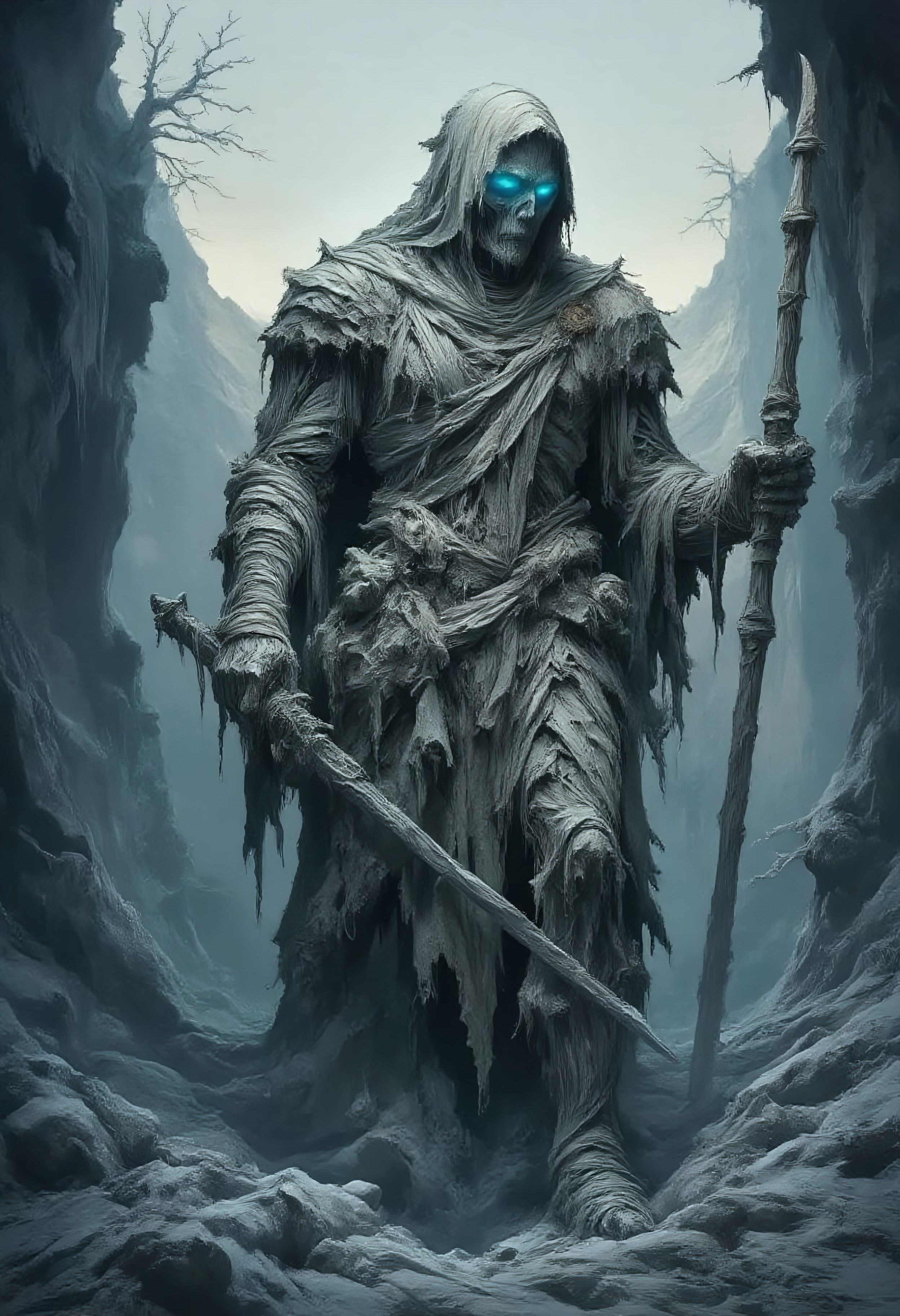 A cinematic and highly detailed portrayal of a mummy warrior, its ancient, bandaged body exuding an eerie, otherworldly power. The warrior stands in the heart of a cold, desolate hellscape, surrounded by frost-covered ruins and jagged, icy terrain. Shadows twist and dance around it, as if alive, forming ghostly, skeletal figures. The mummy wields two ethereal scythes, their blades shimmering with an icy, spectral glow, leaving trails of cold mist as they move. The bandages on its body are tattered and frayed, revealing patches of frostbitten flesh and glowing, rune-like markings pulsing with a pale blue light. Its hollow eyes burn with an intense, cold flame, exuding menace and sorrow. The background features towering glaciers and frozen, twisted trees, while a pale, ghostly light from a distant, icy moon casts long, dramatic shadows across the scene. The overall atmosphere is chilling, fantastical, and hauntingly beautiful, capturing the warrior's deadly grace and the unyielding cold of its cursed existence.