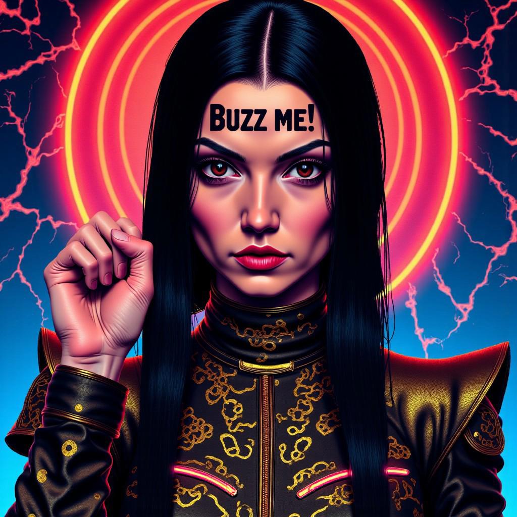 a propaganda poster features a vibrant portrait of a female anarchist, her long dark hair intricately braided, cascading over her shoulders. She wears futuristic attire that blends cyberpunk elements with a Byzantine aesthetic, including a high-collared, metallic jacket adorned with intricate gold patterns and glowing neon accents. Her expression is one of defiance and determination as she raises a clenched fist in a symbol of resistance. The background is a kaleidoscope of neon lights and digital graffiti, merging the old-world artistry with a dystopian future, creating a powerful, celebratory image of rebellion and hope. She looks directly towards the camera. surreal magic realism style. on her forehead is written "Buzz me!"