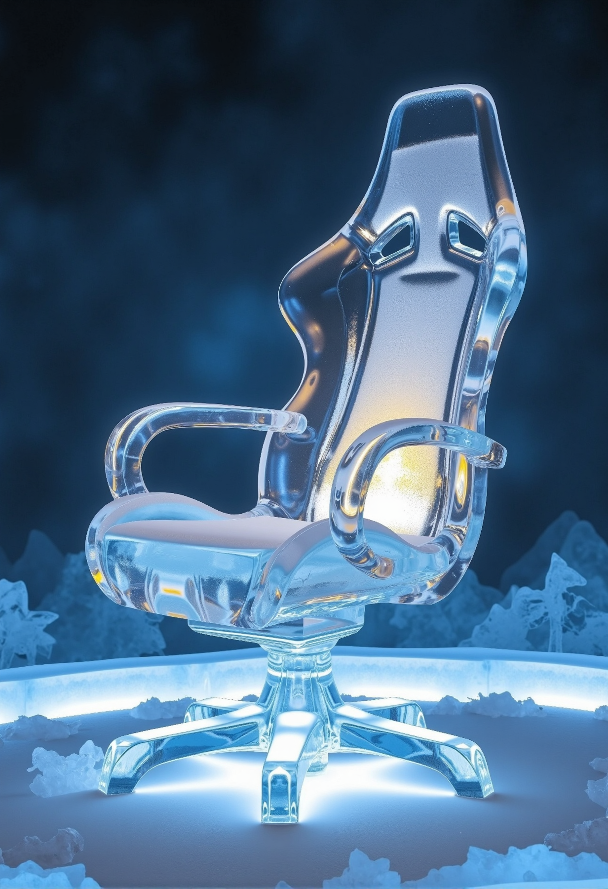 A gaming chair sculpted from pure, transparent ice, with smooth surfaces that beautifully refract light. The armrests and backrest feature elegant, flowing curves. The base is a central ice pillar branching into five crystalline legs. A cold blue and white LED glow emanates from within, highlighting the intricate details. The background is a frosty mist, enveloping a dark abyss, with cold, frosty air swirling around the base, enhancing the chilling atmosphere. The chair stands as the central focus in an ethereal, surreal environment.