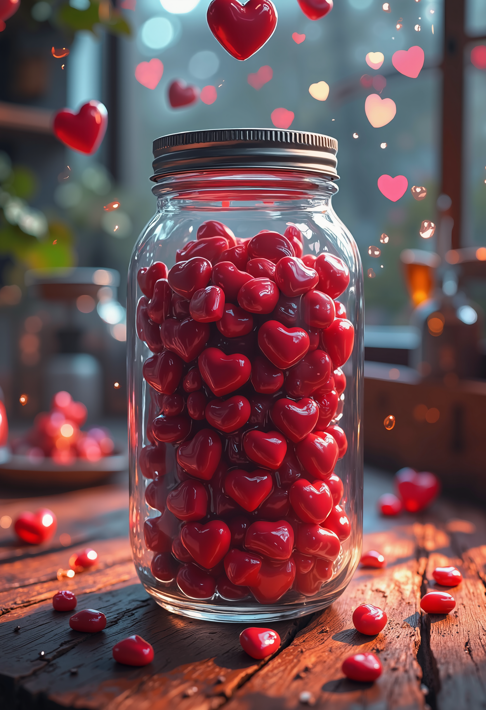 bo-neon, bo-abyss, bo-romance, a highly detailed, digital artwork depicting a glass jar filled with red heart-shaped candies, the jar is made of clear glass with a metal lid, and the candies are small and round, with a glossy, almost glossy texture, they are arranged in a random, overlapping manner, some overlapping each other, creating a sense of depth and dimension, the jars are placed on a wooden surface, which appears to be a rustic, dark brown color, possibly a table or countertop, the background is blurred, with out-of-focus, greenish-blue hues, suggesting an outdoor setting with natural light filtering through a window, the overall mood of the artwork is romantic and whimsical, with the red candies adding a pop of color and contrast to the neutral tones of the background, the texture of the jar and candies is smooth and reflective, enhancing the realism of the scene, the lighting is soft and diffused, casting gentle shadows that enhance the depth and depth of the image<lora:boFLUX Abyss Neon.safetensors:0.7000000000000001:0.7000000000000001> <lora:Flux\boFLUX digital-abyss.safetensors:0.6:0.6> <lora:boFLUX Romance Abyss.safetensors:1.0:1.0>