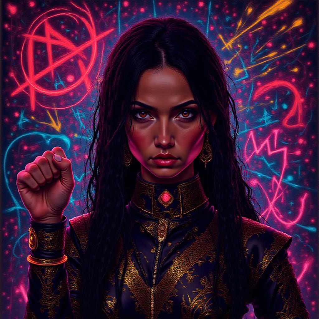 a propaganda poster features a vibrant portrait of a female anarchist, her long dark hair intricately braided, cascading over her shoulders. She wears futuristic attire that blends cyberpunk elements with a Byzantine aesthetic, including a high-collared, metallic jacket adorned with intricate gold patterns and glowing neon accents. Her expression is one of defiance and determination as she raises a clenched fist in a symbol of resistance. The background is a kaleidoscope of neon lights and digital graffiti, merging the old-world artistry with a dystopian future, creating a powerful, celebratory image of rebellion and hope. She looks directly towards the camera. magic realism art