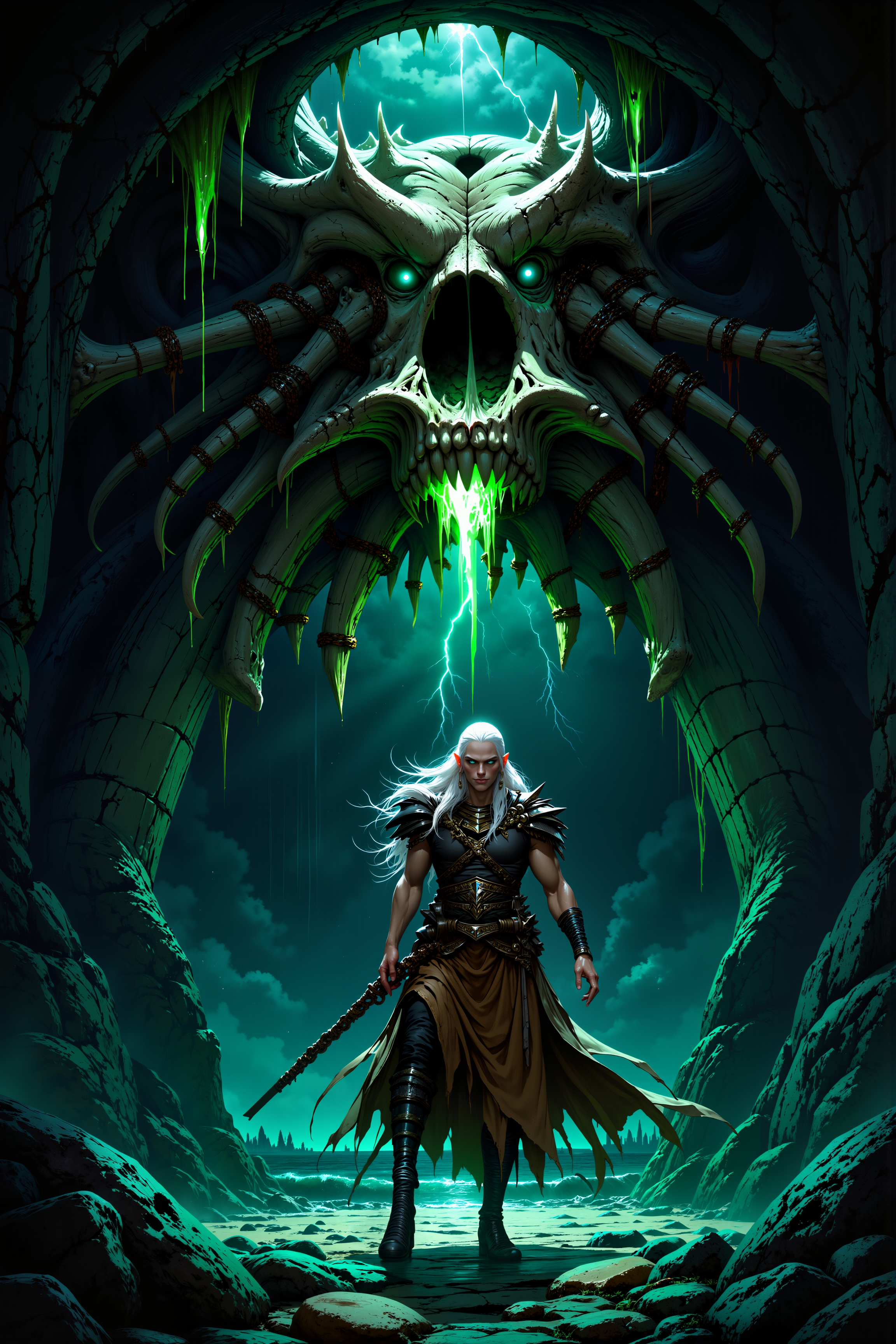 Inside the hollowed-out skull of a long-dead titan, a pale elf with long, flowing white hair and glowing teal eyes is chained to the massive, jagged bones of the creatureâs ribcage. The interior of the skull is bathed in an eerie, green light that emanates from the veins of crystal growing out of the titanâs bones, casting long, sharp shadows across the cracked and uneven floor. His torn tunic flutters in the stale wind that flows through the gaping eye sockets of the skull, while the rusted chains clink softly with each movement. Beyond the cavernous maw of the titanâs mouth, a dark, stormy sea stretches out into the horizon, with massive waves crashing against the jagged rocks below. The elfâs sharp features are illuminated by the faint glow of the crystals, his skin appearing almost translucent in the dim light, while his fingers twitch slightly as though preparing to summon long-forgotten magic. Above, the ancient bones creak and groan with the weight of centuries, their hollow echo filling the space with a sense of impending doom. The air smells faintly of salt and decay, mingling with the metallic tang of the enchanted chains that bind him. In the distance, flashes of lightning illuminate the dark clouds, casting brief, violent bursts of light across the sea. Itâs a moment suspended in time, where ancient death and raw, untapped power coexist in a haunting tableau.<lora:Smooth_Mix_-_Flux:0.7><lora:FluxMythP0rtr4itStyle:0.8>