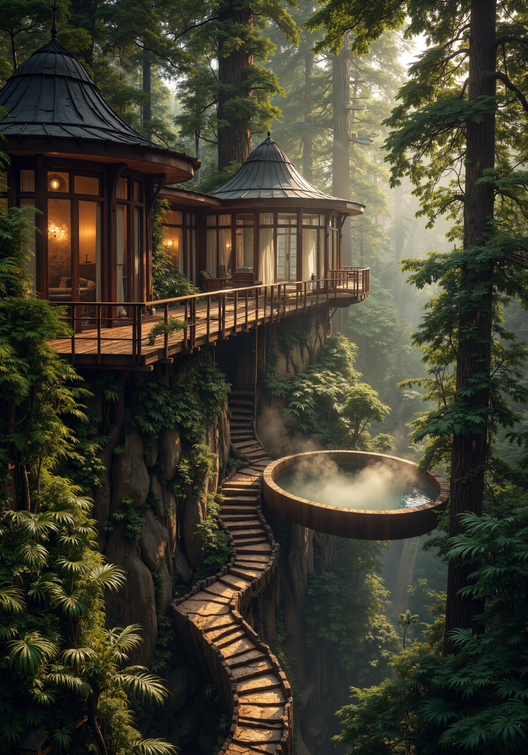 Majestic treehouse spa nestled in an ancient redwood forest, towering wooden structures connected by swaying rope bridges. Luxurious open-air treatment rooms with panoramic forest views, natural hot spring pools steaming amidst lush ferns. Ethereal mist swirling through verdant canopy, dappled sunlight filtering through leaves. Rustic-chic interiors featuring polished driftwood, moss-covered stone, and hand-woven textiles in earth tones. Glass-floored meditation pavilion suspended over a serene koi pond. Soft ambient lighting from artisanal lanterns, aromatic cedar and eucalyptus scents wafting through air. Intricate botanical mosaics adorning walls, cascading living plant walls. Cozy nooks with plush organic cotton robes, panoramic windows framing majestic redwoods. Hyper-realistic details, 8k resolution, masterpiece quality, cinematic lighting. <lora:VividMidjourneymimic-Flux_v1.0:0.2> <lora:Dark side of light:0.2> <lora:test2-000013:0.6> <lora:flux_dev:1>