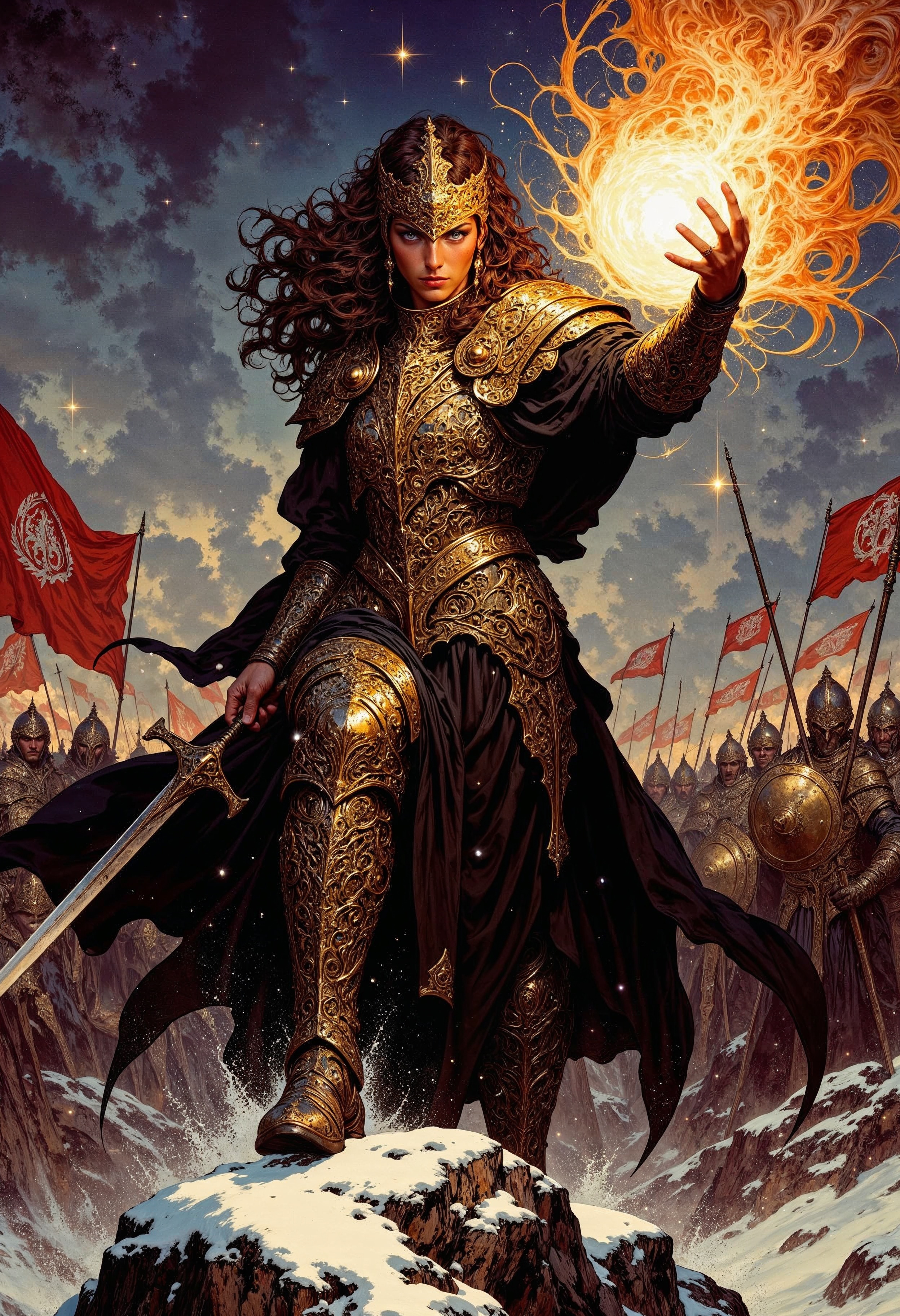intensely focused Viking woman warrior with curly hair hurling a burning meteorite from her hand towards the viewer, the glowing sphere leaves the woman's body getting closer to the viewer leaving a trail of smoke and sparks, intense battlegrounds in snowy conditions, army banners, swords and shields on the ground <lora:FluxMythV2:0.6> <lora:ck-painterly-fantasy:0.6> <lora:flux.1_lora_flyway_Epic-detail_v2:0.5> <lora:RetroAnimeFluxV1:0.6>