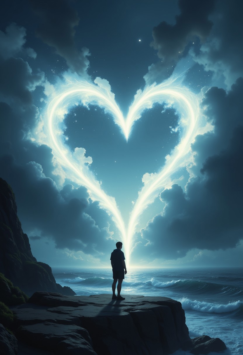 "A silhouette of a person standing on a cliff, staring at the ocean, with a heart-shaped cloud breaking apart in the stormy sky." , aidmaLOVEboost, aidmamj6.1, aidmafluxpro1.1