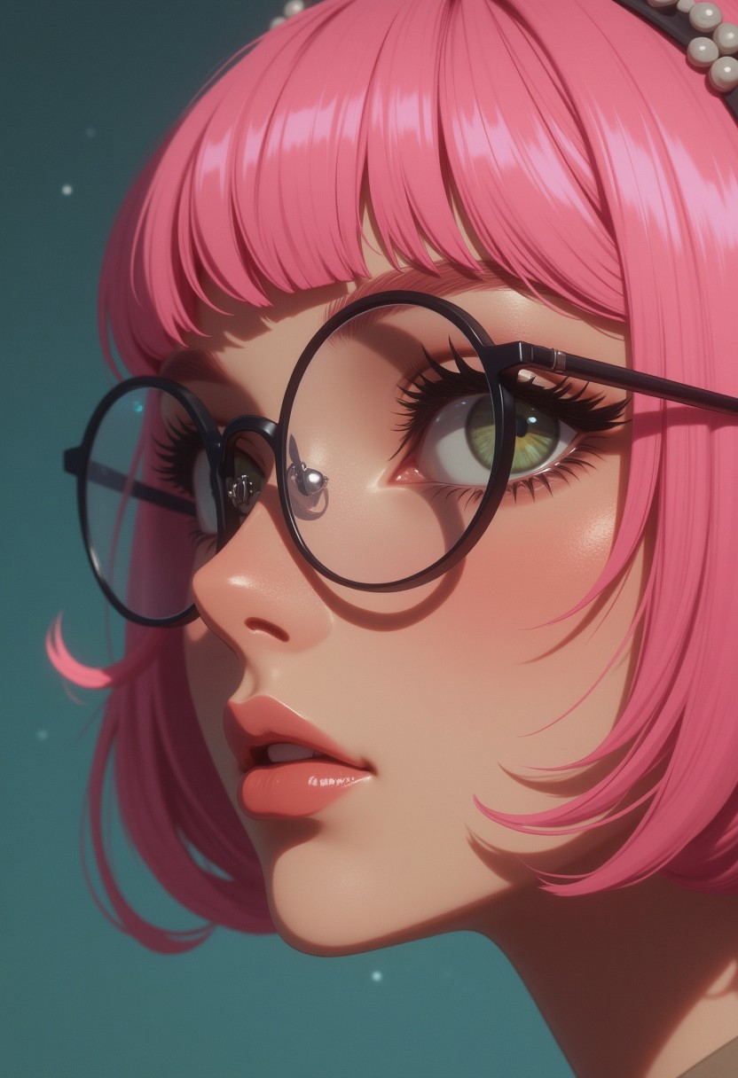 masterpiece, best quality, hyperrealistic digital painting by Jeremiah Ketner and Charlie Bowater and Stanley Artgerm and Thomas Saliot and J. Scott Campbell, shallow depth of field, bokeh, incredibly detailed, real, lifelike face, realistic, round thin-rimmed glasses, pink hair, green eyes, deep gaze, side view, extreme close up, blurred background,