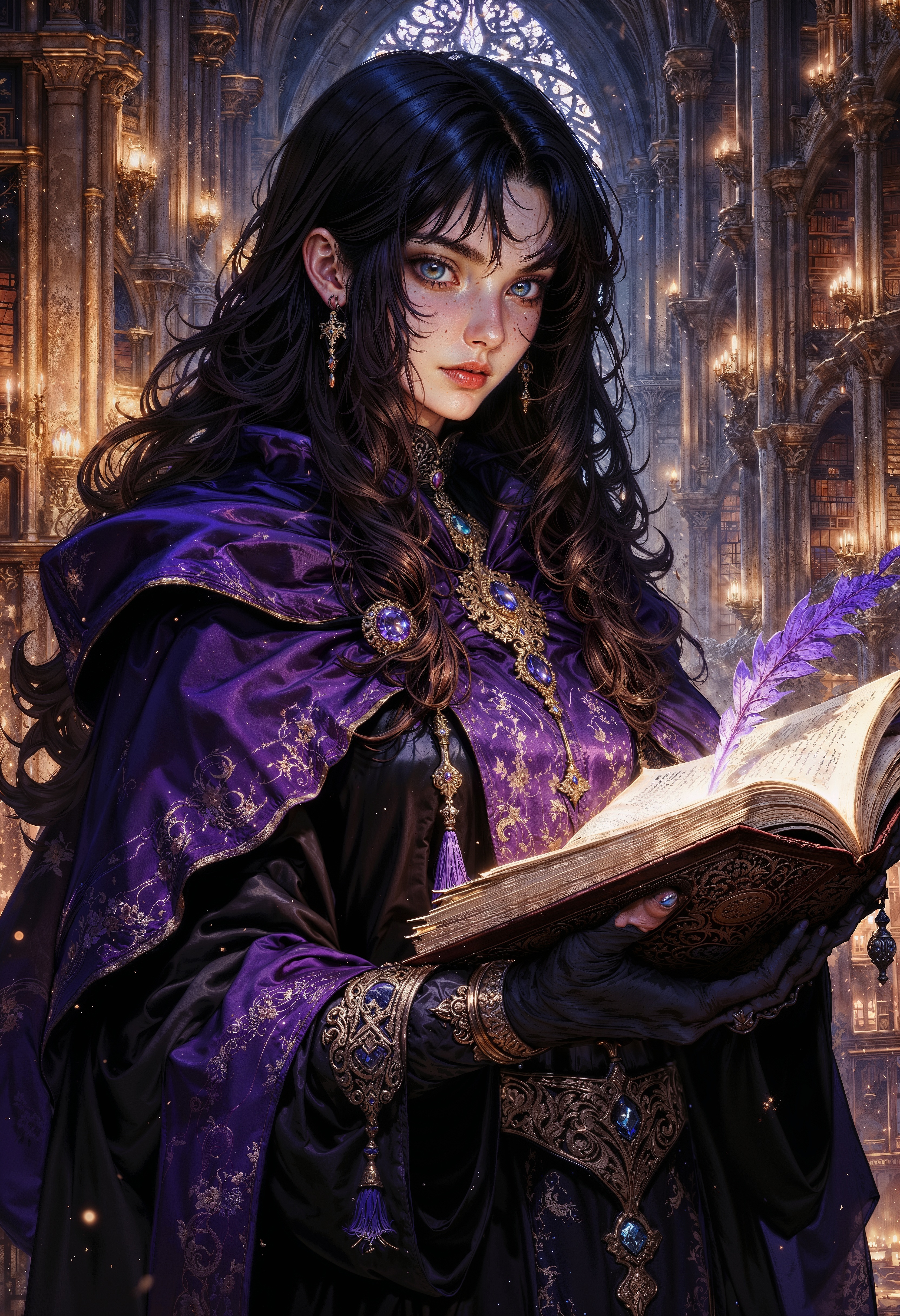 A mysterious librarian of forbidden knowledge, Seraphine Vale dwells within a vast, candlelit cathedral library where the very air hums with arcane whispers. Her long, raven-black hair cascades down her back, partially covering a velvet cloak embroidered with eldritch symbols. Her piercing violet eyes glow faintly, revealing glimpses of the secrets she guards. In one hand, she holds an ancient tome bound in shadowy tendrils that seem to move on their own; in the other, an ethereal quill that writes prophecies in midair. The dim light flickers as she turns a page, revealing glyphs that shift and rewrite themselves. The air is heavy with dust and the scent of aged parchment. Gothic fantasy, dark academia, highly detailed, atmospheric lighting. <lora:RetroAnimeFluxV1:0.5> <lora:FluxMythG0thicL1nes:0.6> <lora:Elden_Ring_-_Yoshitaka_Amano:0.6>
