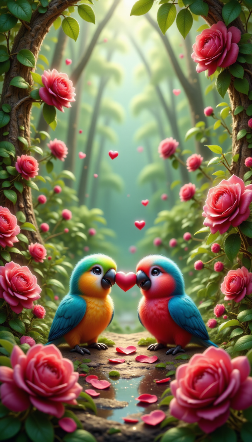 pinkchibivalentine, aidmaloveboost, In a tropical jungle with bright, exotic flowers, a colorful chibi parrot gently drops a single red rose petal into another parrot's beak, both with fluffed-up feathers.