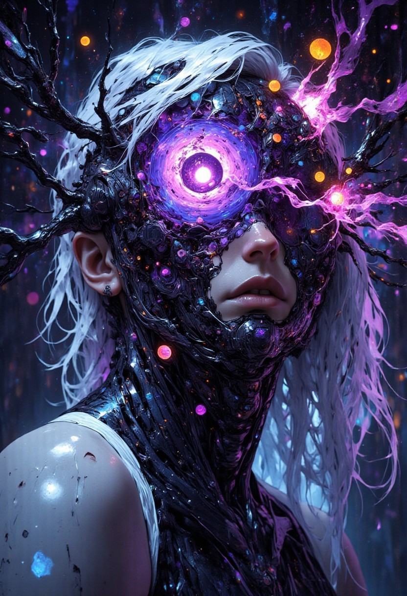G0thicL1nes, nistyle, manga skatch, A close-up of a person's face, pale shoulders, glowing white hair, partially covered by a cosmic mask that is dissolving, its edges unraveling into tendril-like streaks of glowing stardust. The mask disintegrates in a pattern resembling shattered glass, each fragment revealing swirling nebulae and infinite galaxies within with a great depth. The tendrils stretch outward, warping space, as if tearing through reality itself. The background remains a normal setting— a quiet room —contrasting the surreal distortion of the mask. Sharp, high-contrast lighting emphasizes the depth of the cosmic effect, with bright cosmic purples, deep blues, and golden highlights shimmering against the mundane backdrop. The glass-like cracks refract light, distorting the view, making it unclear where the person ends and the cosmic void begins.