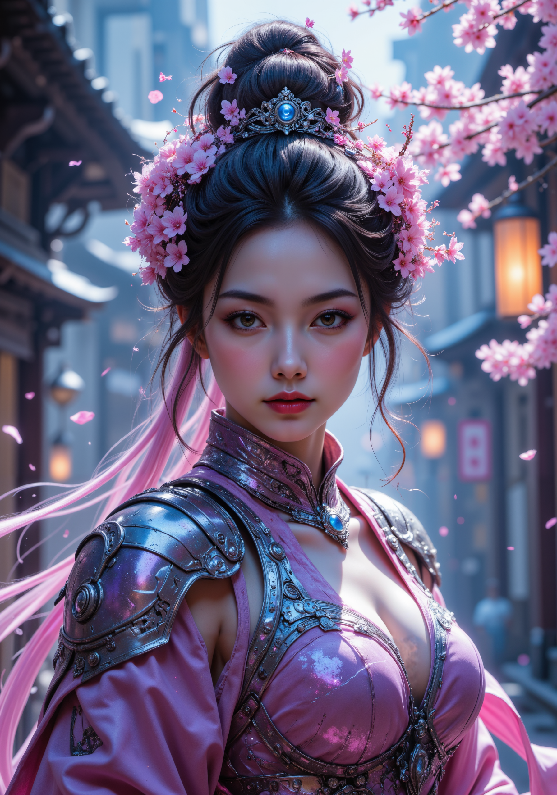 Holographic Samurai Empress, a mesmerizing fusion of ancient Japanese warrior culture and futuristic technology. Her face, a perfect blend of stern determination and ethereal beauty, shimmers with iridescent hues. Ornate armor, adorned with intricate circuits and pulsing energy lines, reflects a kaleidoscope of colors. Cherry blossom petals, digitally rendered, swirl around her in a phantom breeze. The background shifts between a traditional dojo and a neon-lit cyberpunk cityscape. Her katana, a marvel of quantum engineering, glows with plasma energy. Eyes fierce yet wise, gleaming with augmented reality displays. Hair styled in a complex updo, interwoven with fiber optic strands. The image captures her mid-battle stance, frozen in a moment of intense focus. Hyper-realistic rendering, 8K resolution, cinematic lighting emphasizing the contrast between tradition and future. <lora:Kodak Motion Picture Film style v1:0.4> <lora:FluxMythR3alisticF:0.5> <lora:artisketchyfs-v02:0.6> <lora:SameFace_Fix:0.6> <lora:Cyber_Beauties_Ethanar:0.2> <lora:nwsj_flux0924:0.3> <lora:flux_dev:1>