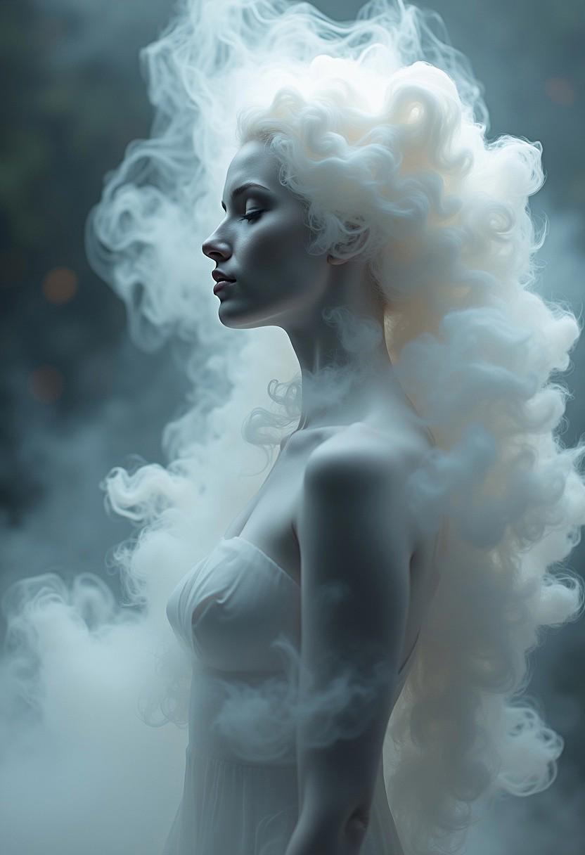 The image features a smoke-like representation of a beautiful goddess, which appears to be a white and gray goddess. The smoke is billowing upwards, creating a visually striking and artistic effect. The smoke is so dense and well-formed that it resembles the shape of a beautiful goddess, making it an interesting and unique sight. This artistic representation of a goddess using smoke adds a creative and captivating element to the scene.