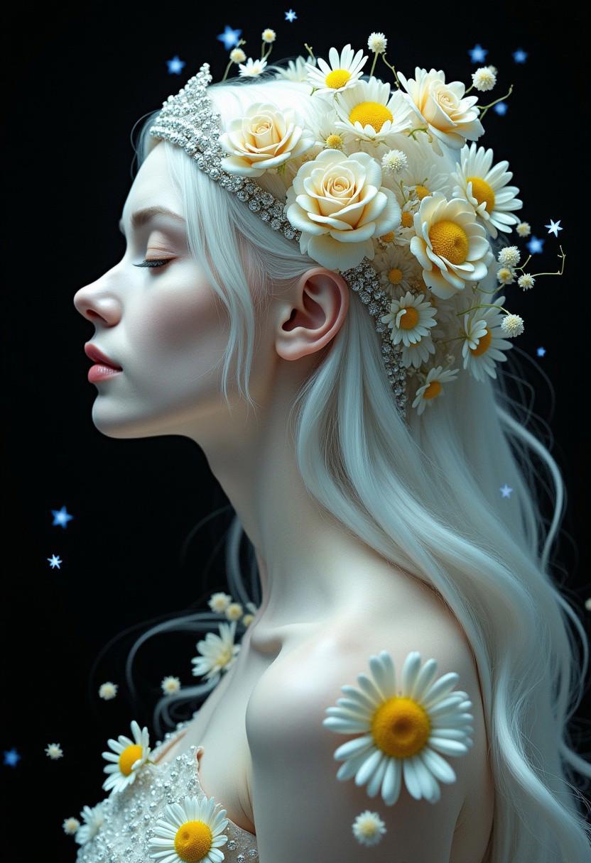 An ethereal 3D side-profile image of a woman with pale skin and flowing white hair, blending into an arrangement of white and yellow flowers. She wears a silver, jeweled headdress, with intricate roses and daisies woven into her hair. The background is black with scattered blue star-like accents, emphasizing the surreal, artistic atmosphere of the scene.