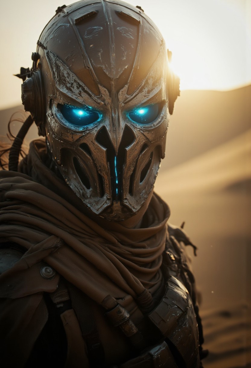 A hyper-detailed, faded close-up of the eye area of a radiant armored Elysium Scout soldier tactical high collar Jacket in the midst of an epic desert battle. His helmet is intricately adorned with sharp ridges and glowing blueish slits for eyes, appearing like burning fractures in the metal. The focus is razor-sharp on the glowing eyes, while the rest fades into a blend of light refractions and soft blur effects. Dust particles swirl through the air, caught in the blinding desert light.
