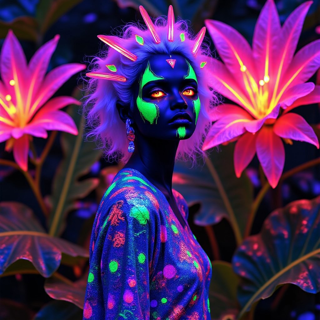 A portrait of a unusual slender black person with geometric face painting in neon colour and special fluorescent neon hair. He is standing in a neon environment with neon plants and huge flowers. The image create a otherworldy, interesting, astistic, moonish, sad neon party atmosphere.