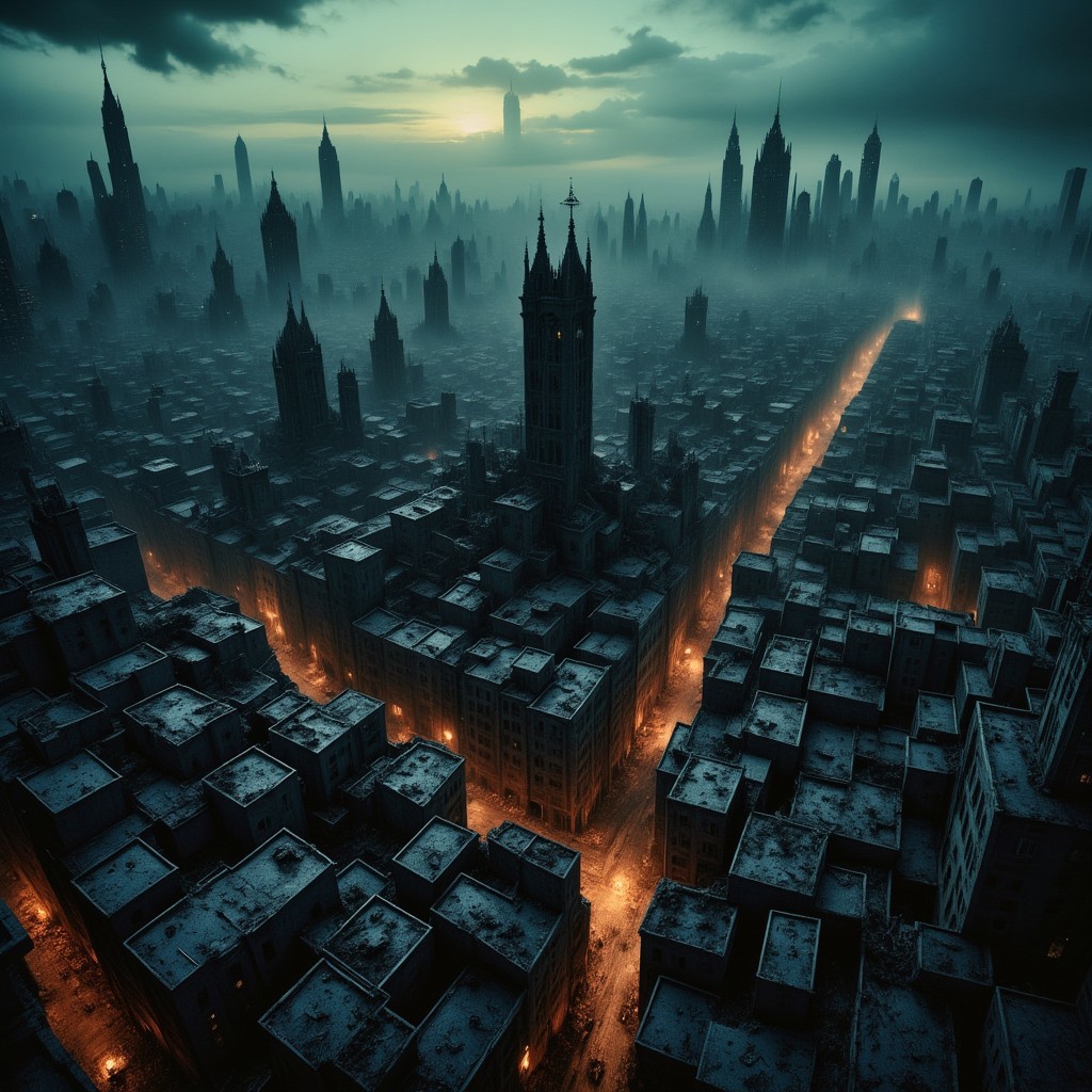 high quality, 8K Ultra HD, AERIAL VIEW OF a metropolis where elements of nightmarish surrealism converge into a scary, gore, horror scene, Escher's influence is subtly incorporated, FILM GRAIN, transforming the city into an intricate, mind-bending spectacle, Stark contrasts between light and dark enhance the dreamlike quality of the scene, creating an unsettling yet captivating urban horrific dreamscape, photorealistic, ultra realistic,aidmaimageupgrader,