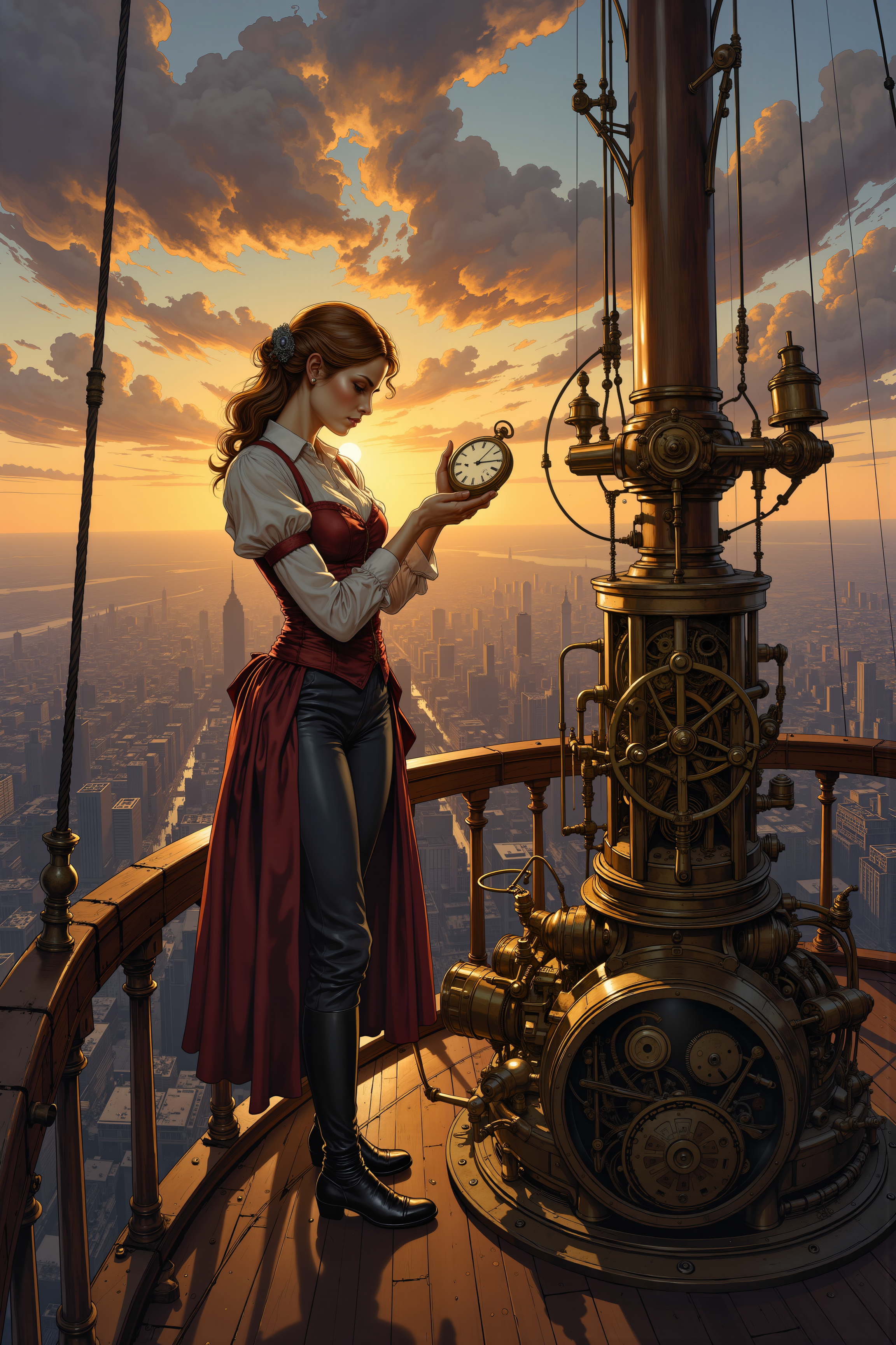 Atop the observation deck of a colossal, steam-driven airship, a noblewoman in an elegant yet practical corset-and-trousers ensemble glares at the pocket watch in her hand. The intricate, gilded timepiece, a supposed marvel of modern engineering, ticks wildly out of sync, its hands spinning in unpredictable directions. She shakes it furiously, but the mechanism only responds with an ominous clicking noise before going still entirely. The sky around her is painted in hues of amber and violet, streaked with clouds that glow in the fading light of the setting sun. Below, the sprawling cityscape hums with the energy of gas lamps and factory smokestacks, stretching toward the horizon in an endless sprawl of brass and stone. Her perfectly polished boots tap impatiently against the metal deck, and a passing automaton steward tilts its head at her predicament with a soft whir. With an irritated sigh, she snaps the watch shut and stuffs it into her pocket, vowing to have sharp words with its inventor. Somewhere in the distance, the low groan of an airship engine echoes, a reminder that even the grandest of machines are prone to the flaws of their makers. , detailed background Fantastic lighting. Detailed shadows.intricate details, vivid colors, hyper-detailed, ultra-sharp, , <lora:Dorota_Pietrowiak:0.3> Portrait by Dorota Pietrowiak <lora:Comic book V2:0.8> High-contrast illustration
