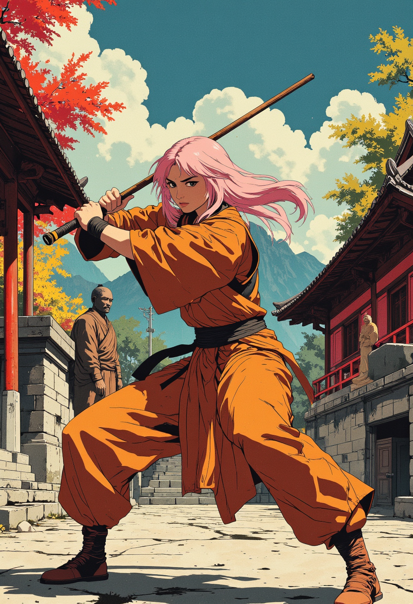 Image is a close up digital fantasy artwork featuring female monk character in a dynamic fighting stance. She has tan skin with pink hair. She's wearing an orange martial arts robe. In her hands is a wood staff. The background is of a buddist temple, concrete ground, lush colorful trees, training dummies, moutains.