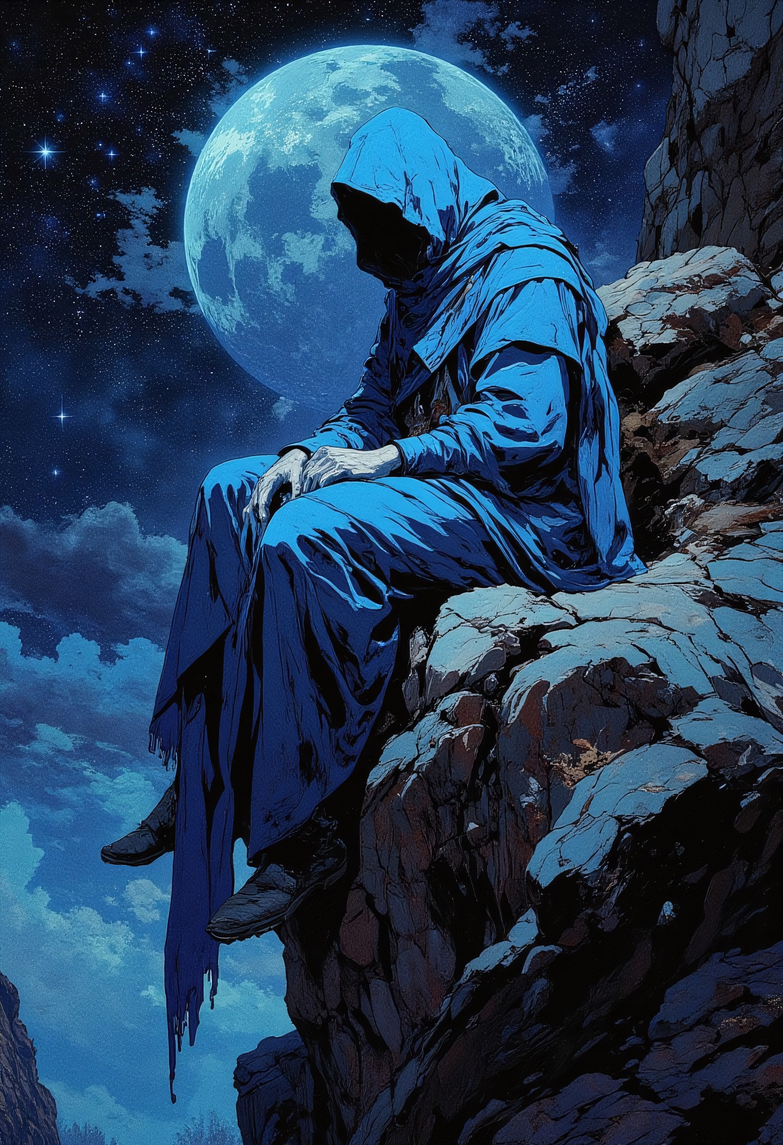 A mysterious, hooded figure draped in a long, flowing blue cloak sits solemnly on the edge of a rugged, rocky cliff. The figure’s face is hidden in deep shadow, adding an aura of enigma and solitude. The background features a vast, dark starry sky with countless shimmering stars, dominated by a large, glowing, bluish moon, casting a faint ethereal light. The rocky formations are detailed, textured, and rugged, creating a stark contrast with the smooth, almost liquid-like fabric of the cloak. The overall mood is surreal, melancholic, and otherworldly, with deep shadows and cool, muted color tones emphasizing mystery and cosmic loneliness