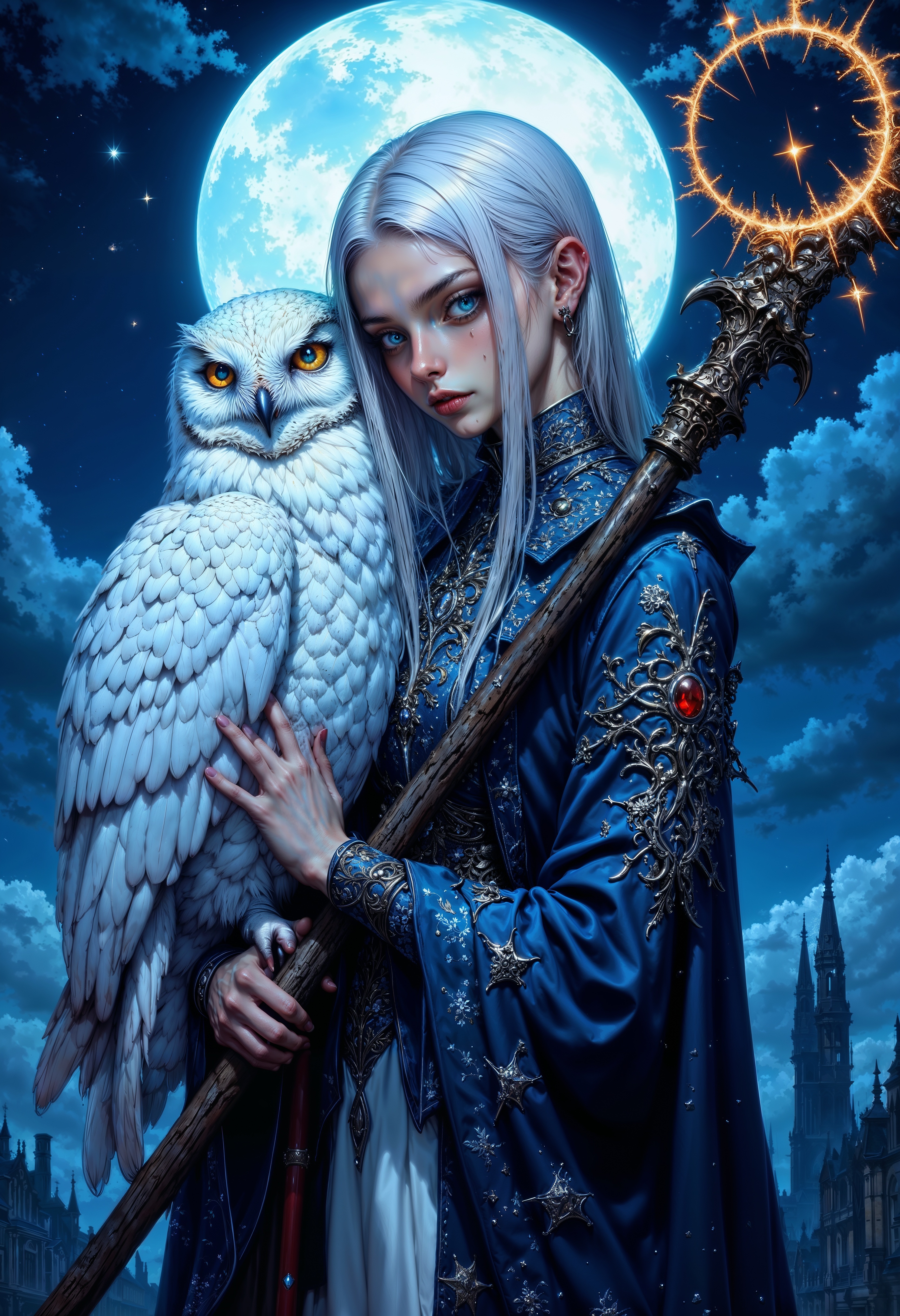 bo-an1me, dark fantasy illustration, high detail fantasy anime, a mystical and ethereal style. The layout is a close-up portrait of a girl with fair skin and striking facial features, including intense eyes and a serene expression. The girl has silver hair and is adorned in a deep blue, starry cloak with intricate silver embellishments. She holds a large, majestic white owl with piercing yellow eyes, which is perched on her arm. The background is a night sky with a full moon, adding to the magical atmosphere. A crescent moon symbol is prominently displayed on a staff held by the girl. The overall composition conveys a sense of mystery and enchantment.