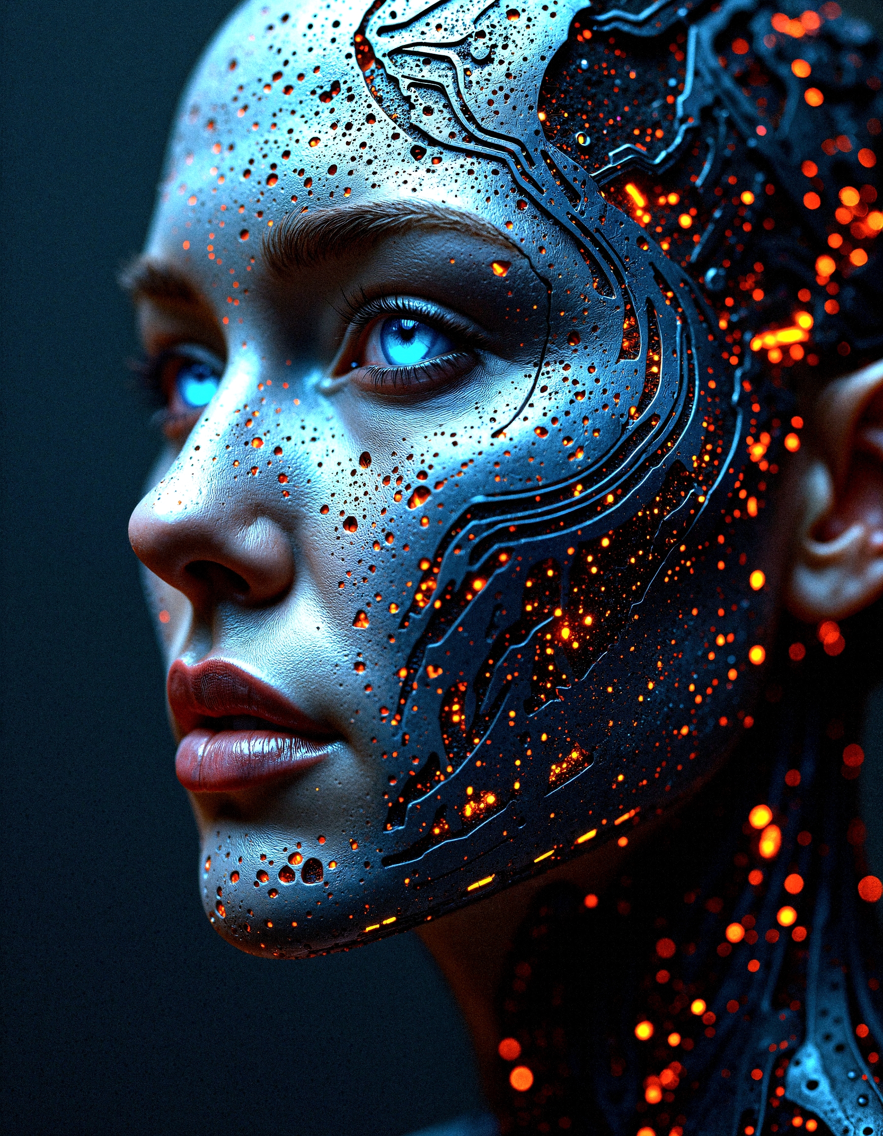 "A detailed cyberpunk-inspired depiction of a face integrated into a digital grid, with glowing circuits and neon orange and blue highlights weaving across its surface. The piercing blue eye shines brightly, contrasting with the textured metallic panels and intricate mechanical components. The background is a chaotic yet harmonious network of glowing data streams, fragmented panels, and geometric patterns, emphasizing the fusion of human emotion and futuristic technology in a surreal, high-tech visual." <lora:FluxDFaeTasticDetails:0.2> <lora:aidmaHyperrealism-FLUX-v0.3:0.8>