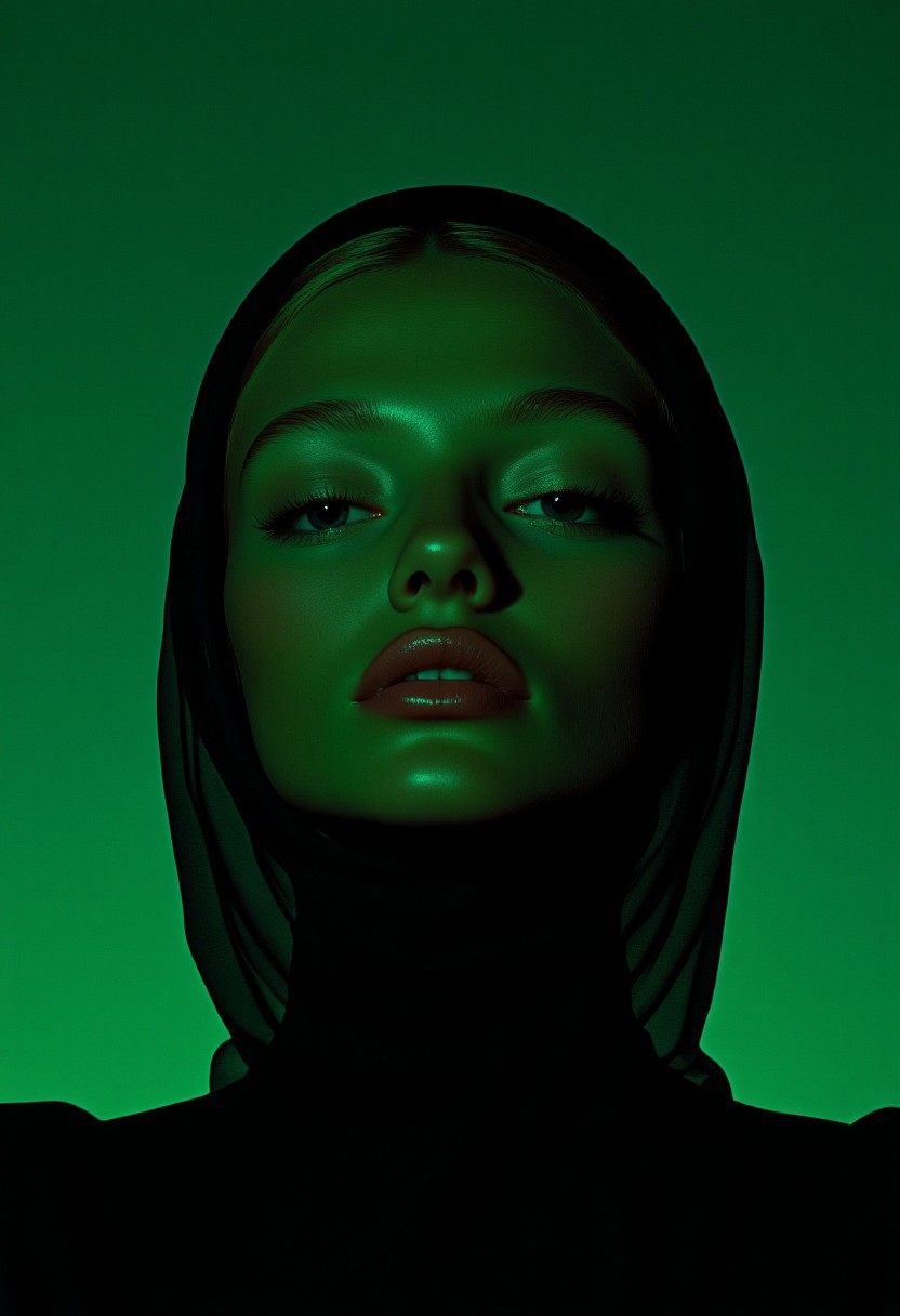 A highly stylized, high-resolution cinematic photograph of a woman’s face, enveloped in a striking green and black palette, where green light casts dramatic, surreal shadows on her fair skin. Her sharp, well-defined features exude serenity as her eyes remain closed, lips slightly parted. A sheer black fabric elegantly drapes over her eyes and forehead, heightening the sense of mystery. Her pulled-back hair enhances the minimalistic aesthetic, emphasizing her natural beauty. The fabric’s smooth, translucent texture subtly interacts with the light, accentuating the interplay of shadow and glow. The background is a soft gradient green, creating a mesmerizing contrast with the black fabric and her skin. The overall mood is one of introspection, artistic elegance, and mastery of light and shadow. (silhouette , aidmamj6.1, lorenastyle, retro futuristic clothing style)